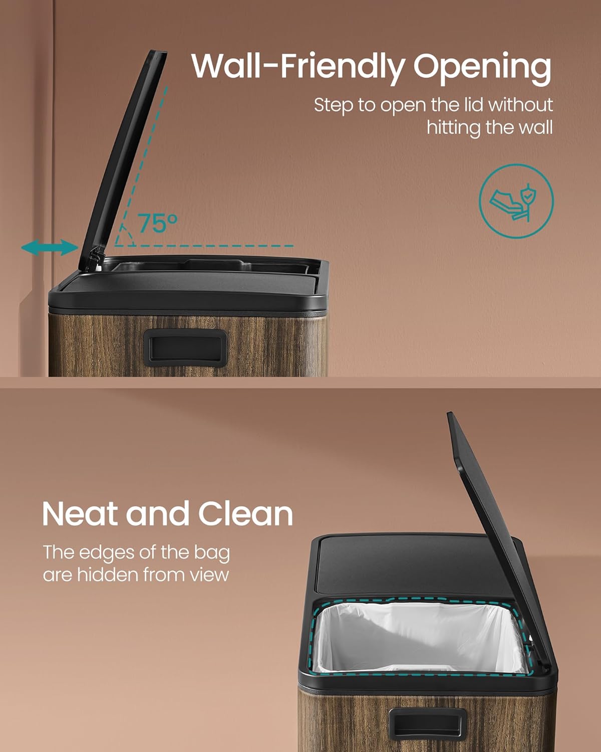 - [A Boon for Your Kitchen] Your garbage can doesn’t have to look like garbage; with a dark walnut color and a simple silhouette, this step trash can will be an eye-catcher in your kitchen