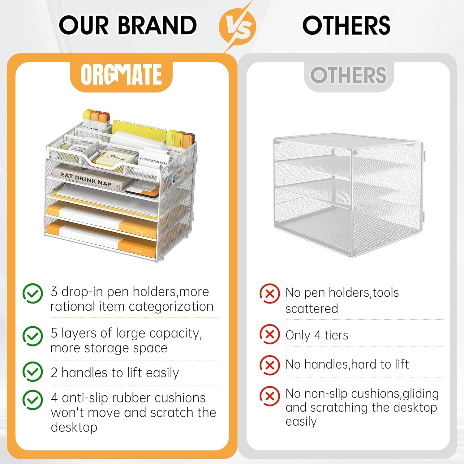 - User Friendly-2 round wrap-around handles + 4 rubber anti-slip feet, provide you with a comfortable grip at the same time, can make the letter tray organiser is not easy to slide and scratch the desktop, to protect the surface of the desktop. Perfect as a file organizer for desk or document organizer, it fits seamlessly into compact workspaces or classroom organization setups