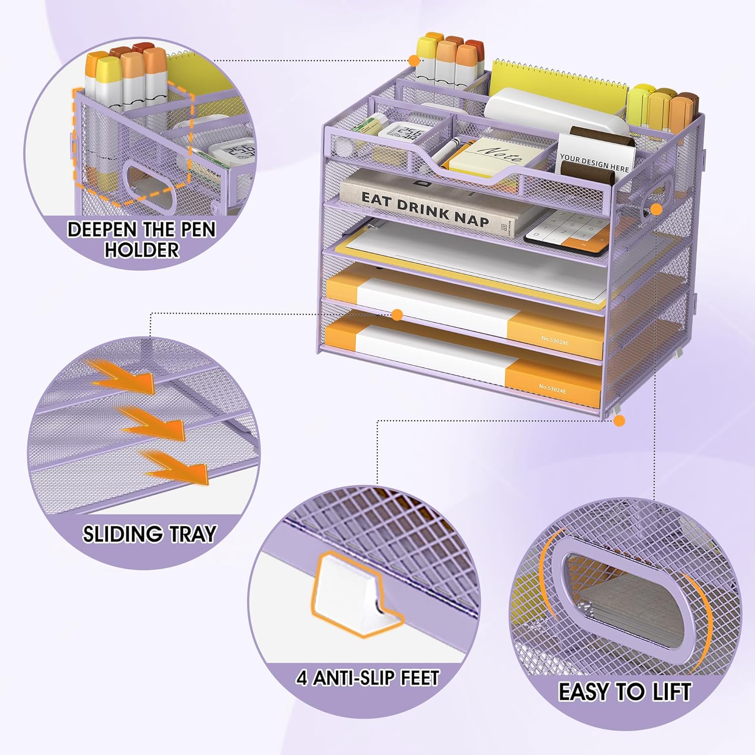 5 Tier Paper Letter Tray with 3 Drop-in Pen Holders, Mesh Desk File Organizer with Handle, Desk Organizers and Accessories for School,Home, Office Supplies Storage-Purple