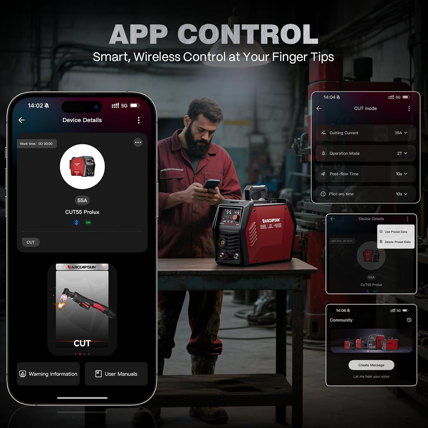- [APP CONTROL] When the plasma cutter is farther away (up to 10 meters), remote control via the APP becomes essential. The APP lets users adjust parameters, monitor real-time performance, and check machine status easily. It also supports switching cutting modes, saving settings, and accessing FAQs—ideal for beginners and future maintenance.