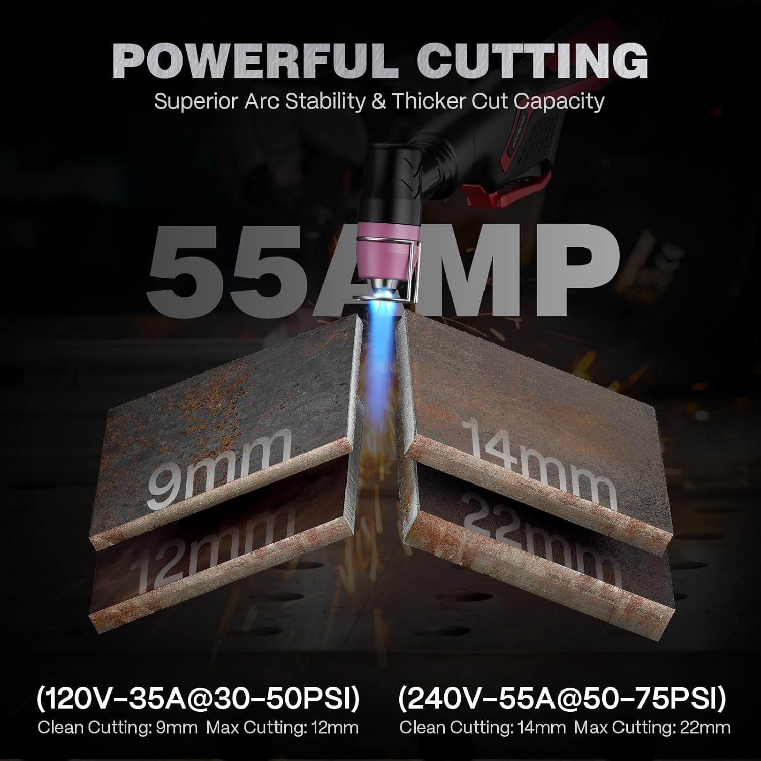 - [IMPRESSIVE CUTTING THICKNESS] Equipped with an upgraded 2nd-Gen MCU, this plasma cutter offers significantly improved cutting performance. It cuts steel up to 7/8"(22mm) thick at 240V and handles stainless steel, carbon steel, aluminum, and copper with ease. The machine produces smooth edges with minimal slag, reducing the need for post-grinding. (Cutting Range: 120V: 9–12mm | 240V: 14–22mm)