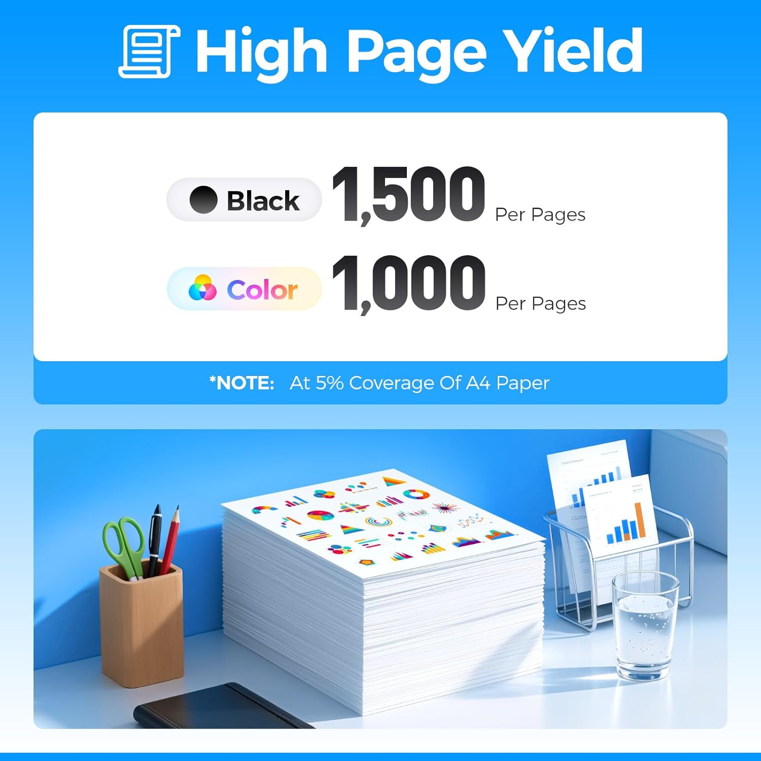 - High Output: Up to 1,500 pages per Black toner cartridge & 1,000 Pages per Color toner cartridge at 5% coverage