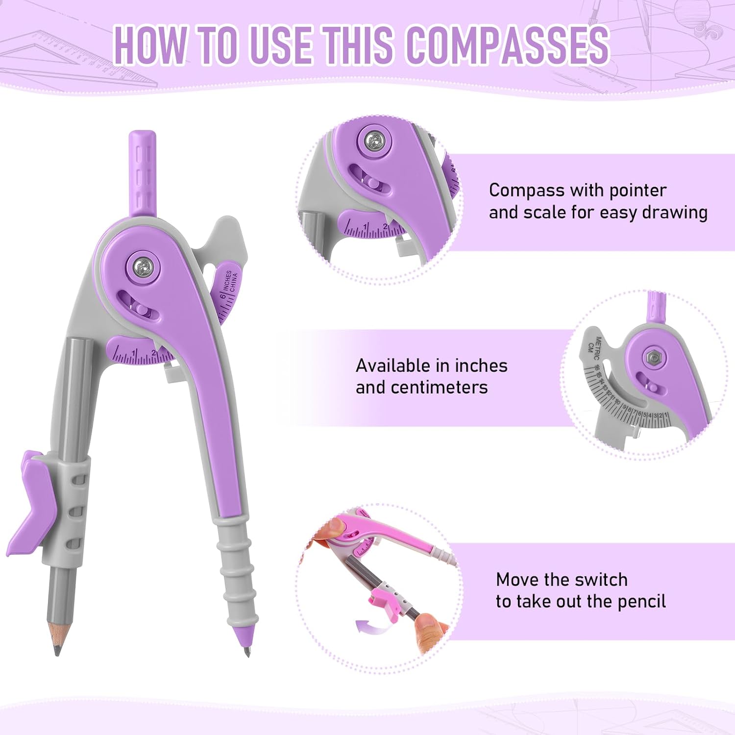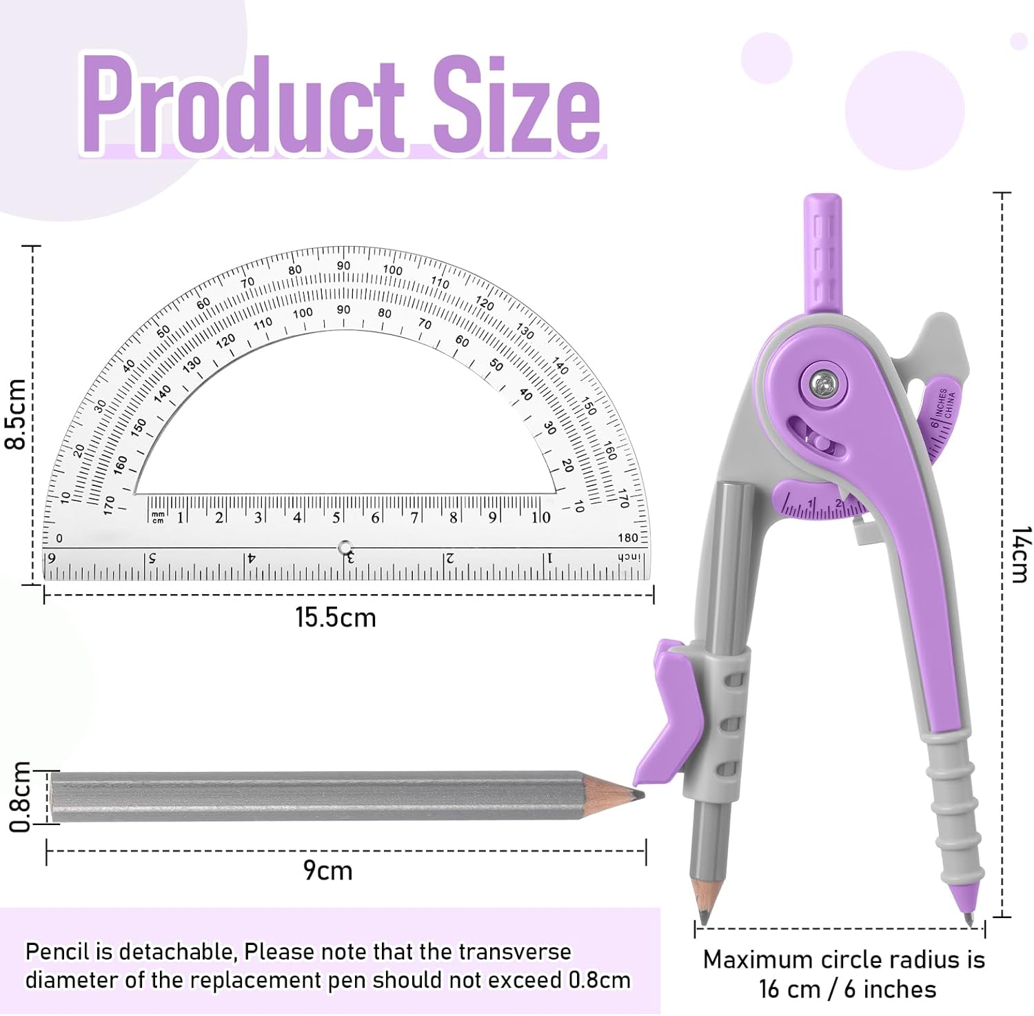 EBOOT Student Geometry Math Set, Drawing Compass and 6 Inch Clear Swing Arm Protractors 180 Degree Math Protractor (Lavender Purple)