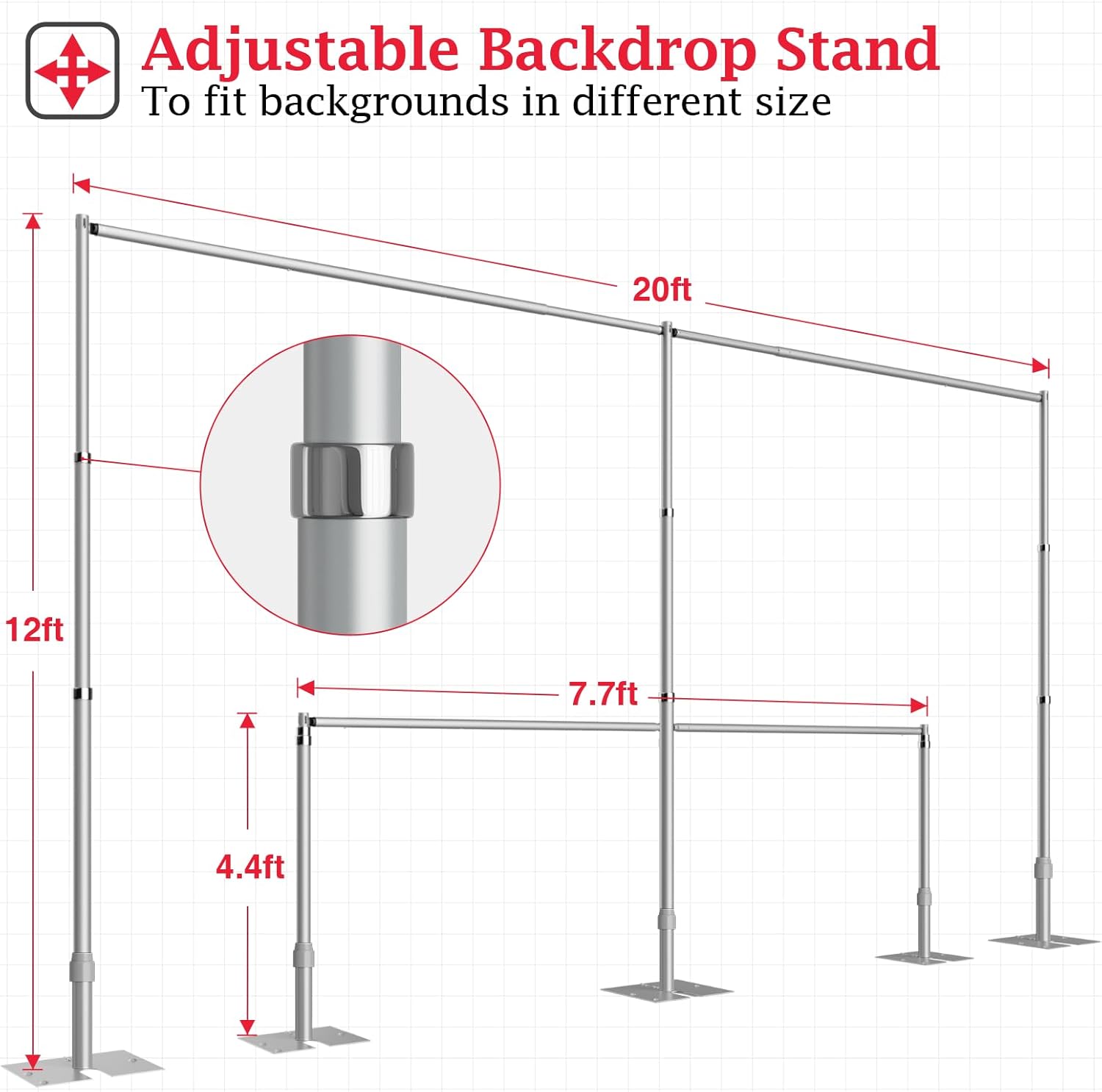- 【Sturdy Photo Background Stand】12x20 ft /3.6x6 m heavy duty backdrop stand. Aluminum and steel framework provides maximum stability and professional durability,Sturdy base legs provide sturdy balanced support for safety and reliability