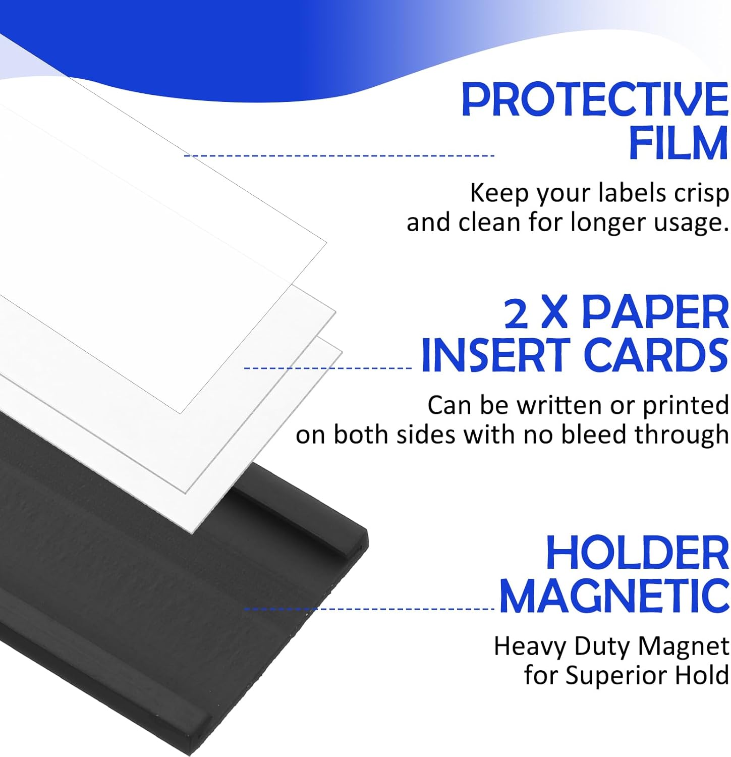 - All Parts Included: Everything you need to organize yourself and the others in only one pack of 60 pcs magnetic label holders! This set of filing cabinet labels includes 60 x magnetic file cabinet label holders, 60 x 2 white label cards, and 60 x clear PVC covers; Create and update labels by sliding the white cards or additional paper inserts into the slot; It's easy to customize each label!