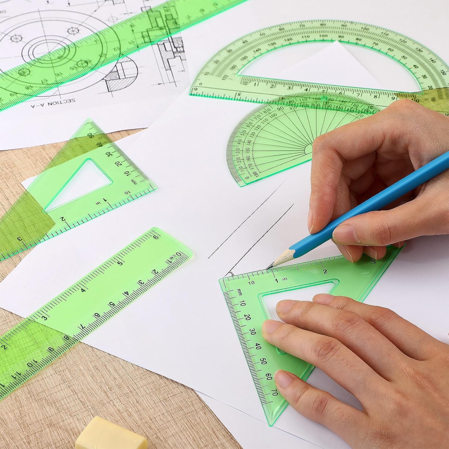 Tenare 1 Set Plastic Clear Math Set Includes Protractor Triangle Rulers 12 Inch 6 Inch Straight Geometry Math Transparent Ruler Measuring Tool for School Office Home Supplies (Green)