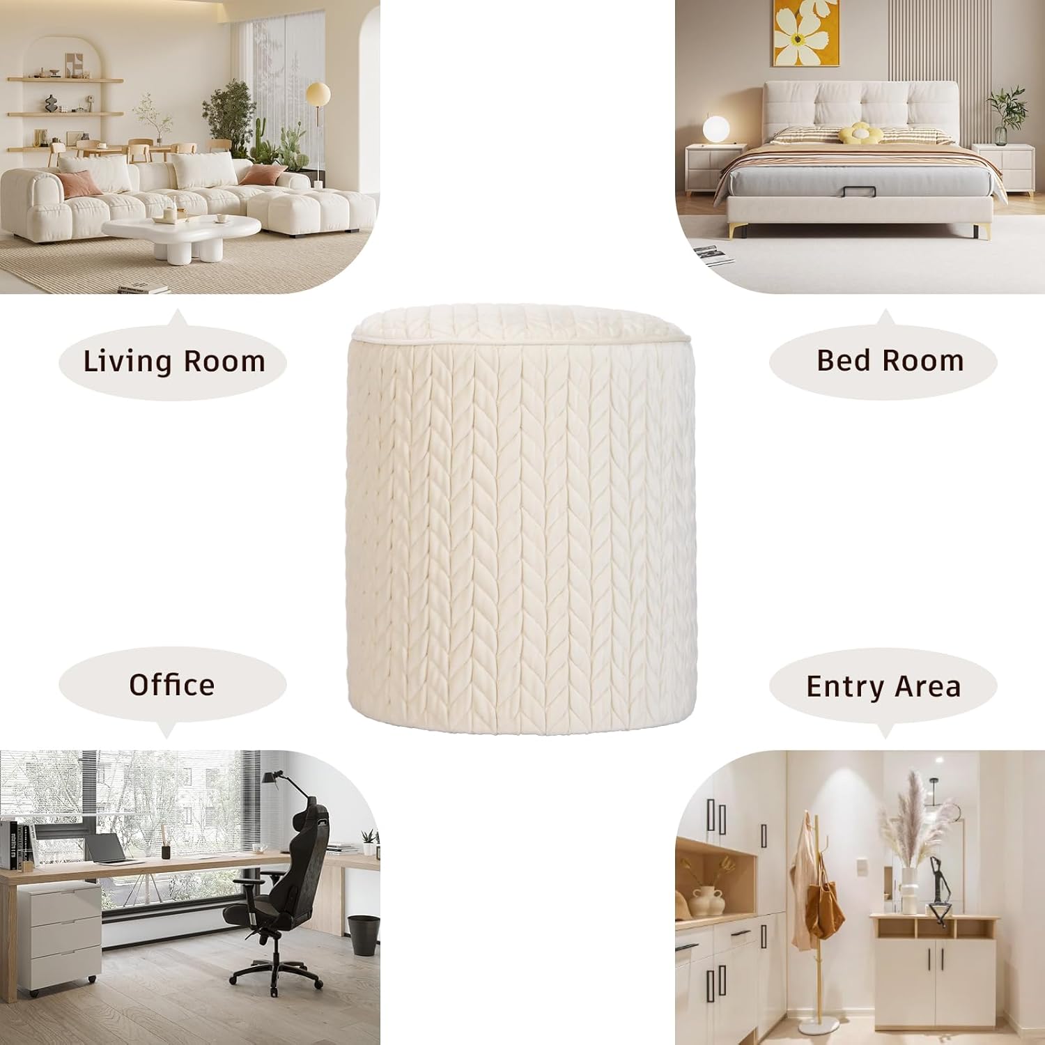 Modern Round Ottoman, Braided-Tufted Foot Stool Ottoman, Velvet Upholstered Vanity Stool for Makeup, Bedroom, Living Room, White