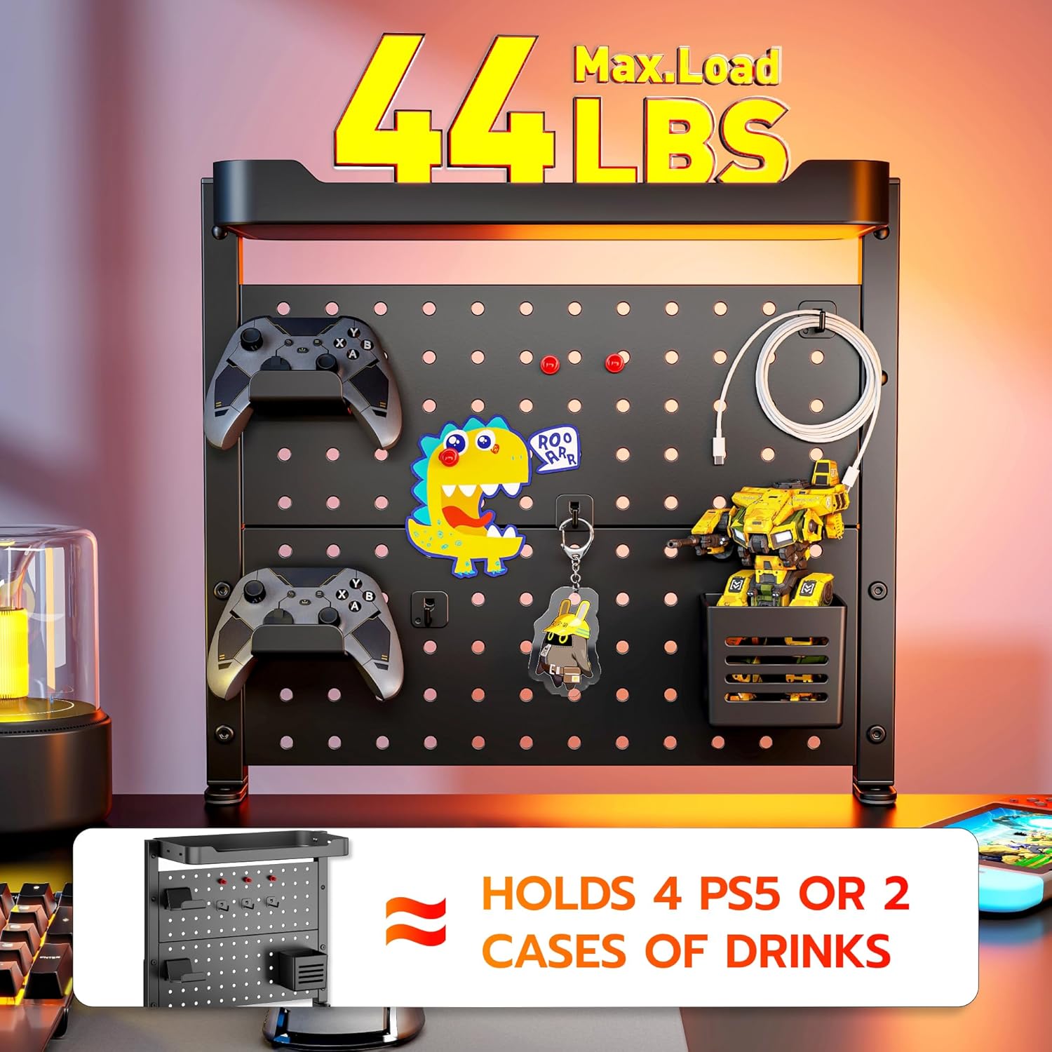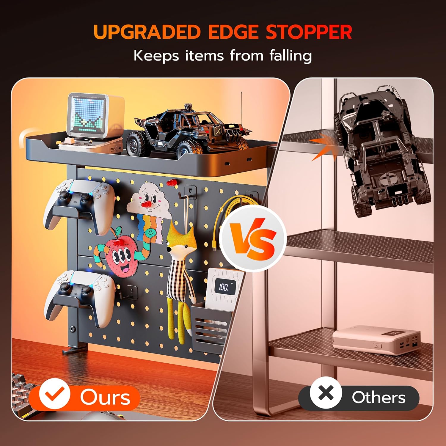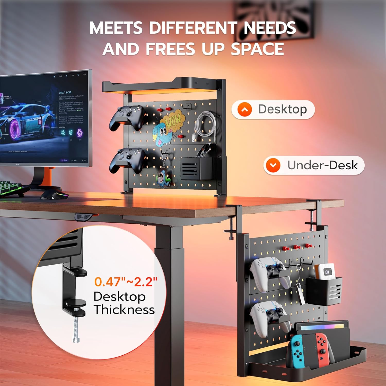 - 【Customizable with Accessories】This peg board shelf offers unparalleled flexibility with its edge-mounted design, supporting both above and under desk configurations. Use the above-desk setup for easy access to frequently used daily items, or opt for the under-desk installation to store cables, chargers, or hidden peripherals discreetly. It includes 2 controller holders, 1 pen holder, 3 magnets, and 3 hooks, allow you to fully customize the setup to suit your specific needs.