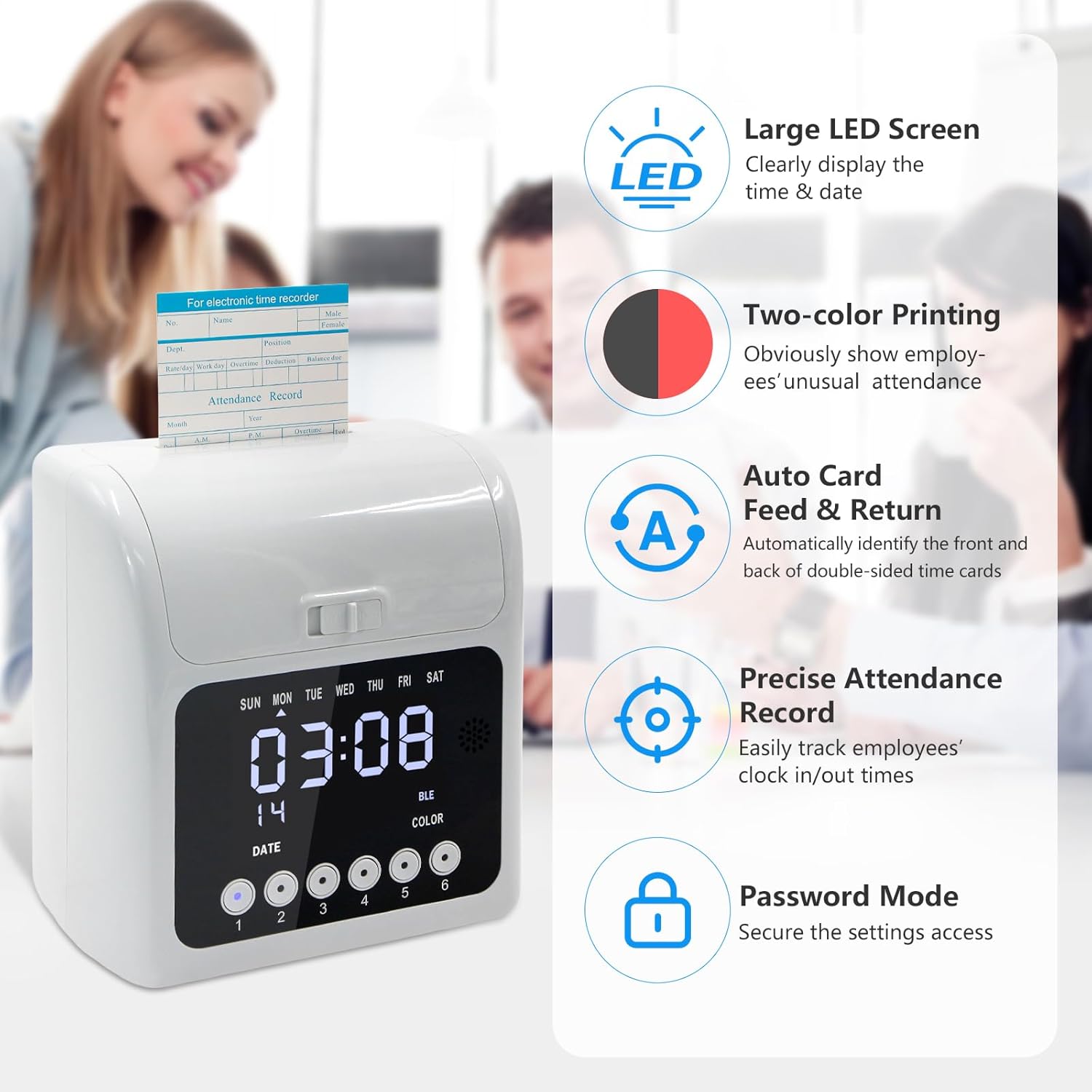 - 𝗔𝘂𝘁𝗼 𝗔𝗹𝗶𝗴𝗻 & 𝗖𝗮𝗿𝗱 𝗙𝗲𝗲𝗱𝗶𝗻𝗴 - The time clock punch machine automatically feeds the time card and identifies its front and back. If the card is not correctly inserted, it will be returned. 𝗡𝗼𝘁𝗲: 𝗜𝗳 𝘆𝗼𝘂 𝘄𝗮𝗻𝘁 𝘁𝗼 𝘂𝘀𝗲 𝘆𝗼𝘂𝗿 𝗼𝘄𝗻 𝘁𝗶𝗺𝗲 𝗰𝗮𝗿𝗱𝘀, 𝗽𝗹𝗲𝗮𝘀𝗲 𝘁𝘂𝗿𝗻 𝗼𝗳𝗳 𝘁𝗵𝗲 𝗮𝘂𝘁𝗼-𝗮𝗹𝗶𝗴𝗻 𝗳𝘂𝗻𝗰𝘁𝗶𝗼𝗻.