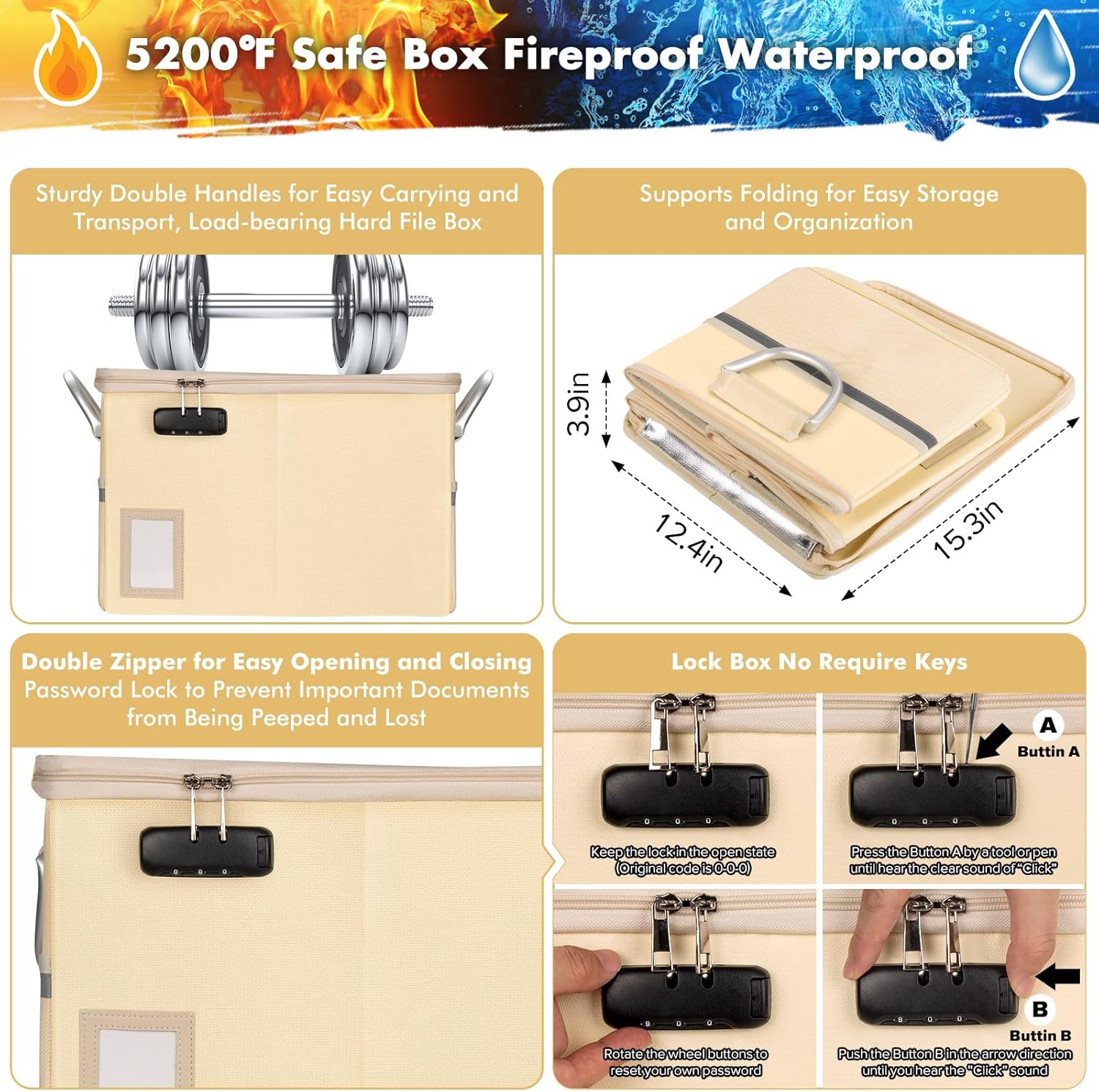 - 5200℉ Waterproof Fireproof Box: Fireproof document box is made of upgraded heat-insulated thickened silicone coated fireproof cotton material and aluminum foil which withstand temperatures up to 5200°F. Fire organizer box is not only fireproof, but also has good waterproof performance, and important documents will not get wet or damp.