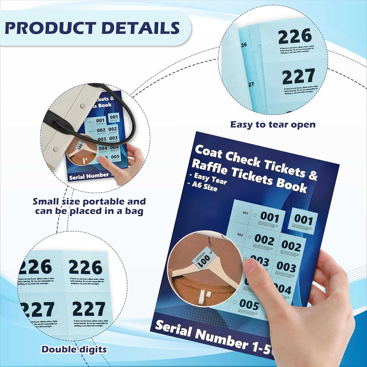 500 Pcs Coat Check Tickets 2 Part Book Bulk 5.8x4.2 Inch A6 Paper Coat Room Tags Raffle Tickets Coat Check Tags 1 to 500 with Hole for Cloakroom Storage or Event Raffle Draws (Blue) (1)
