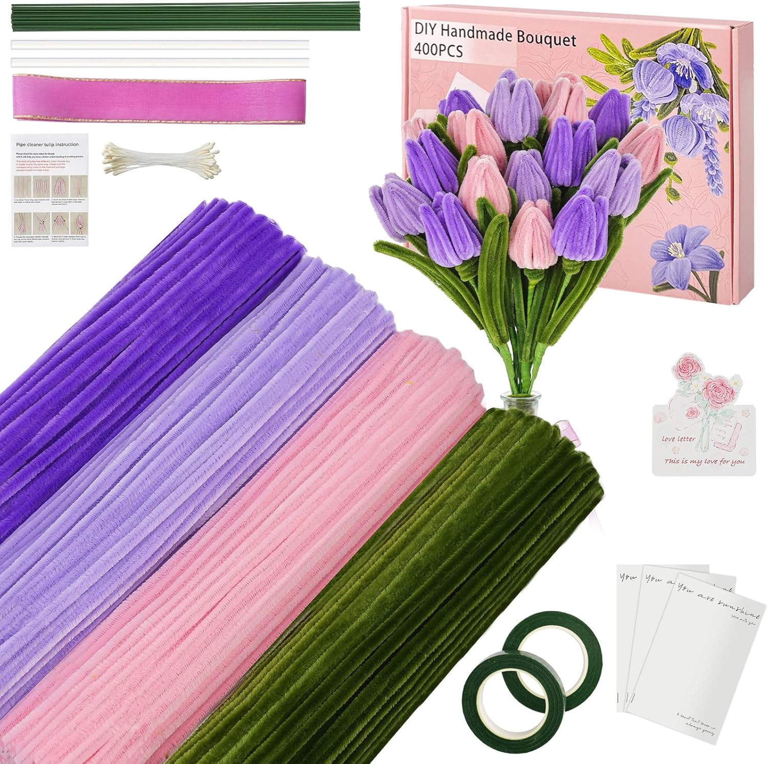 - 💐【Chenille Pipe Cleaners】The product includes all crafting accessories for tulip bouquets: 400pcs pipe cleaner,20pcs floral Wires, 2pcs gardening tape,2pcs hot glue Sticks,1pc greeting card,3pcs bouquet paper, 1 bag stamen ,1pc Ribbon,&1pc instrution.