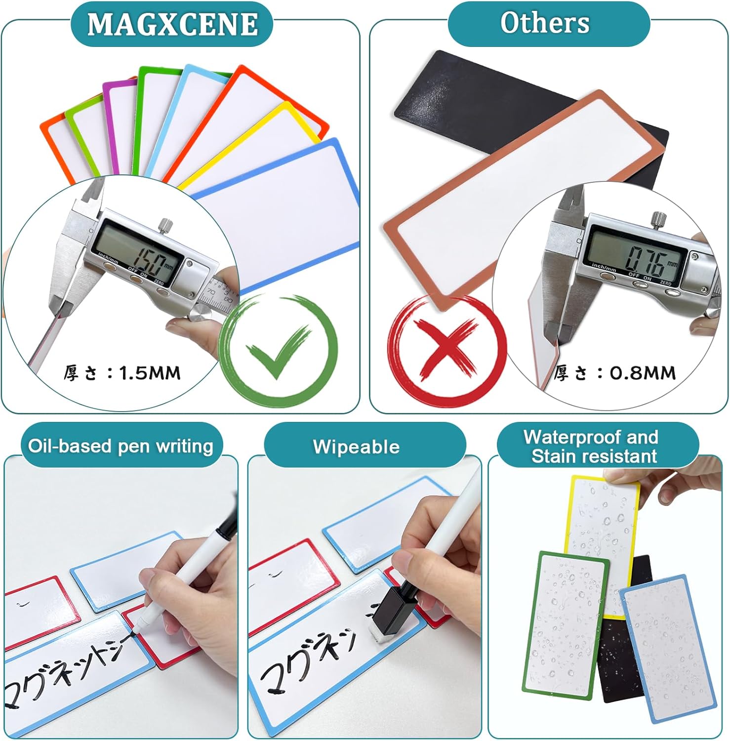 - 【Extra Thick Size】80 magnetic dry erase labels (10 per color, 8 colors) are 0.06 inches thick, more thicker and more resilient than other magnet label on the market. Dimensions: 10 x 5 cm (4" x 2") The 8 colors of magnetic labels are red, orange, purple, green, grass green, blue, sky blue and yellow. These colorful dry erase magnets labels are available in 8 stylish and adorable colors