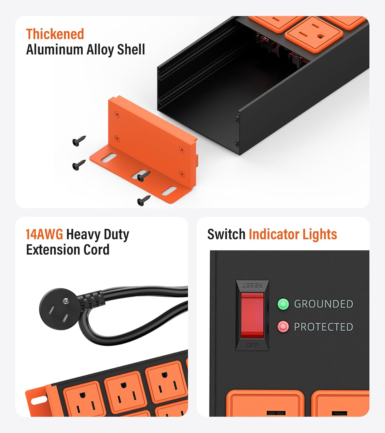- Durable Housing - 8 outlet power strip surge protector - Thickened aluminum alloy shell and quality power modules, provides on/off switch with indicator light, fire retardant. suitable for small kitchen appliances as well as high power industrial equipment, more secure. And designed with bright orange element can make you can find it immediately!