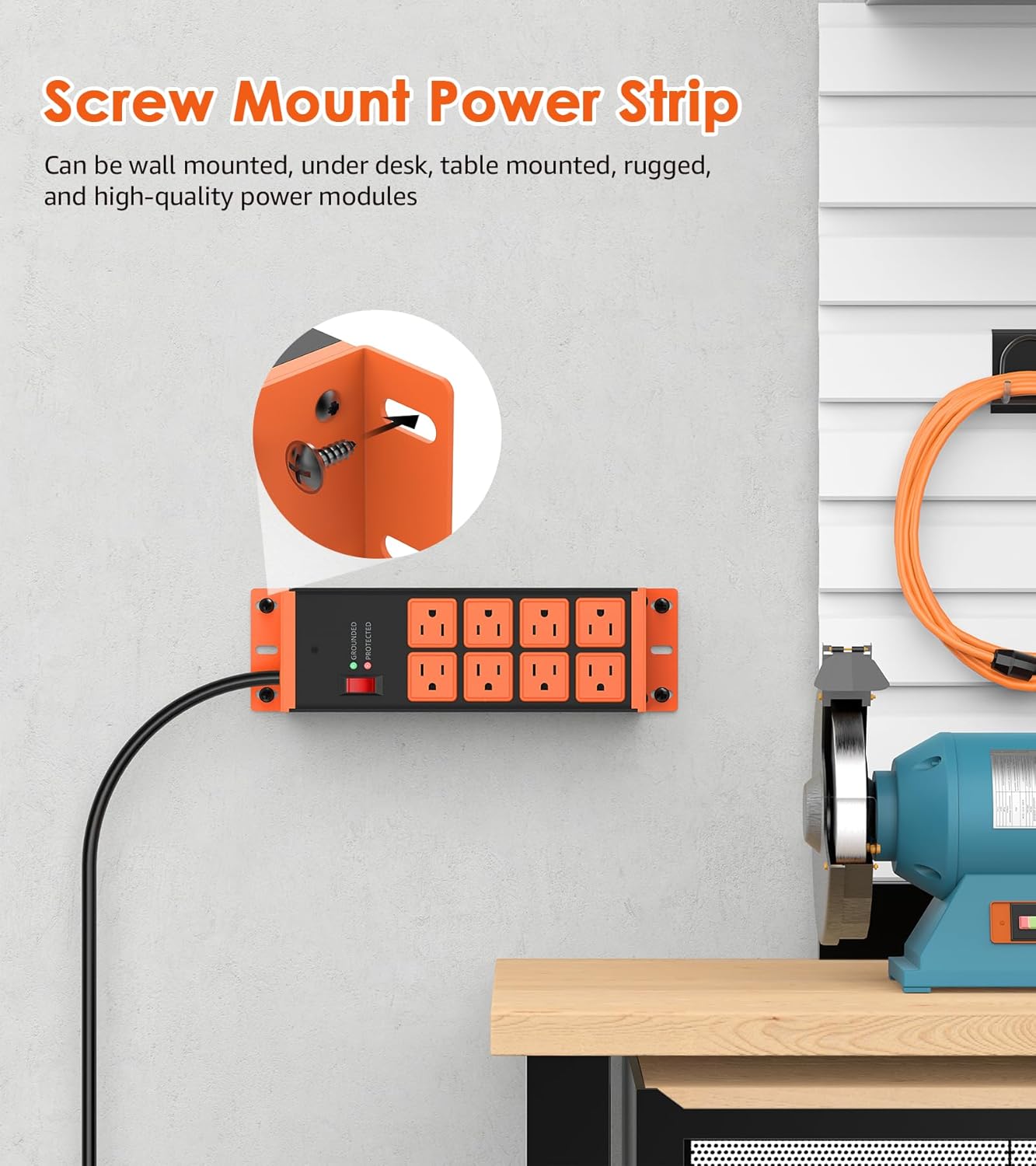 - Screw mount power strip - Garage power strip can be used in wall mounted, under desk, desk mount, All metal housing, rugged and durable. Wood shop power strip suitable for home appliances,power toolsare equally essential in homes,offices,factories,warehouses,garages and other environments