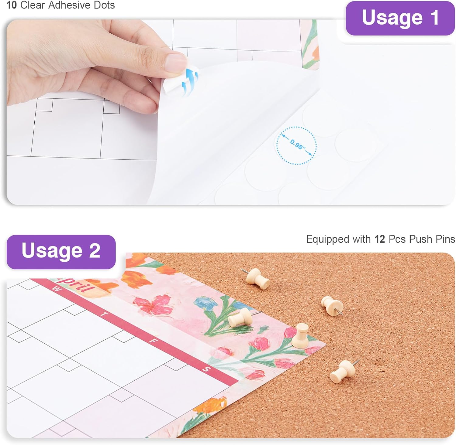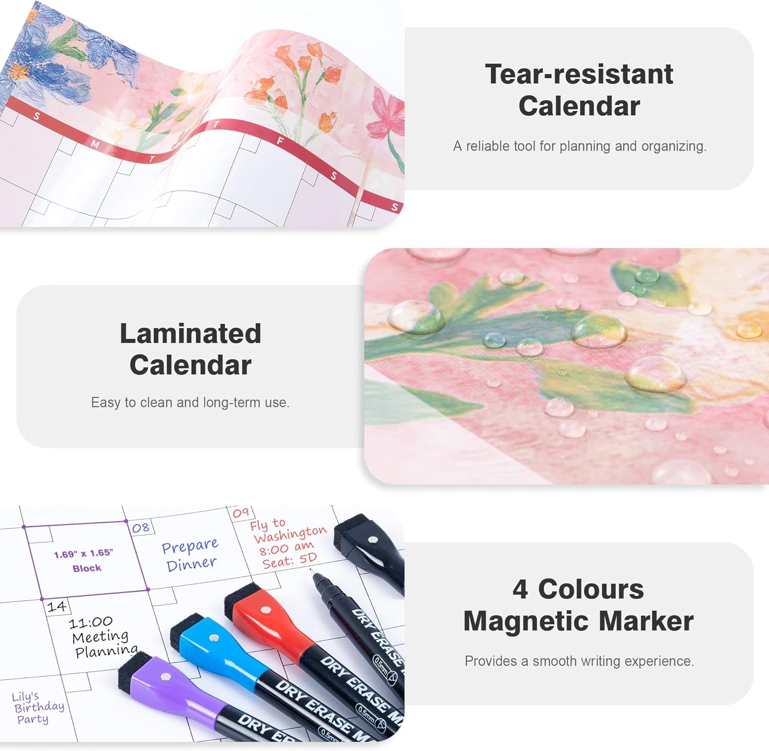 - ✨ Undated Laminated Calendar: This waterproof wall calendar comes with a mini eraser, four dry-erase markers, 10 push pins, and 10 transparent round stickers. The undated monthly calendar can be started at any time, making it perfect for long-term use.