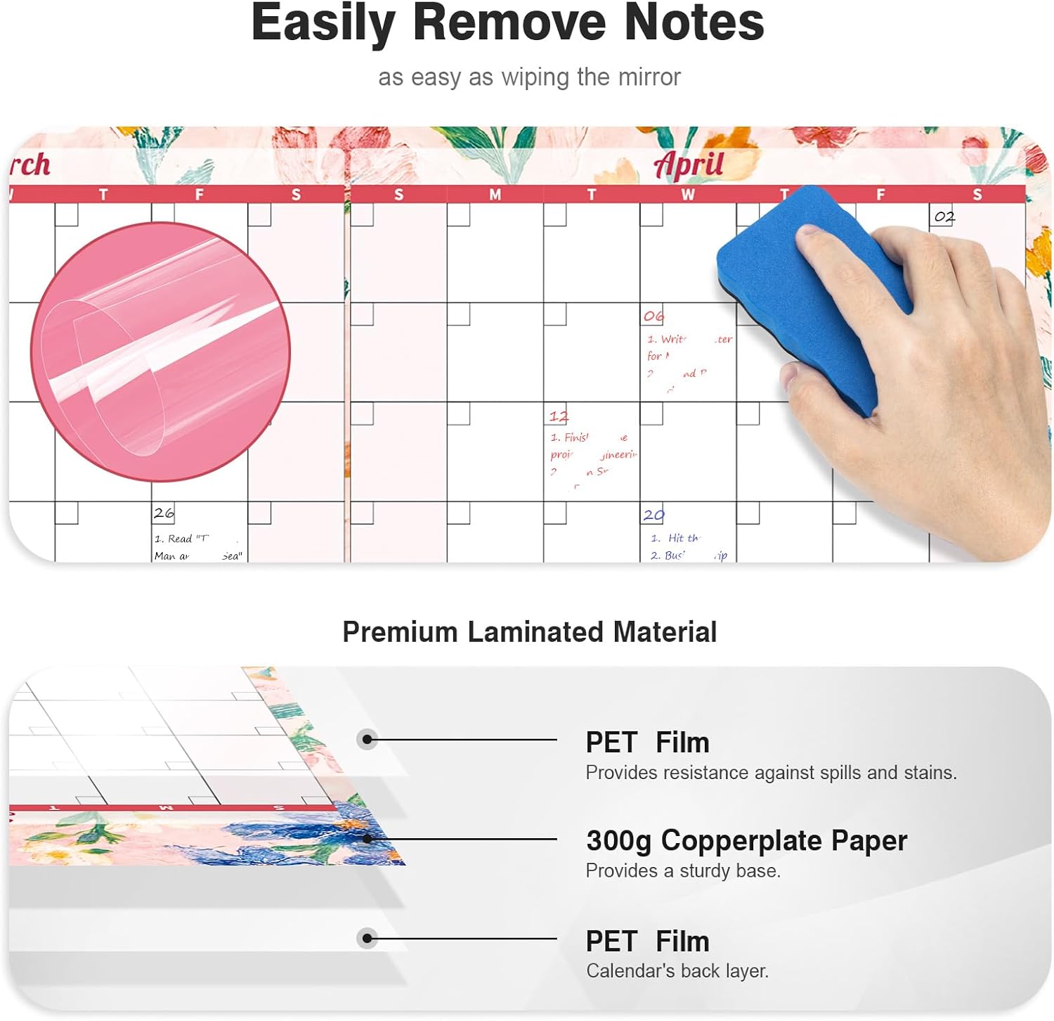 - ✨ Dry Erase Wall Calendar : is made of PET Film and 300 grams Copperplate Paper, providing a durable surface that resists scratches and smudges, while the sturdy Copperplate Paper backing keeps it in place without curling.