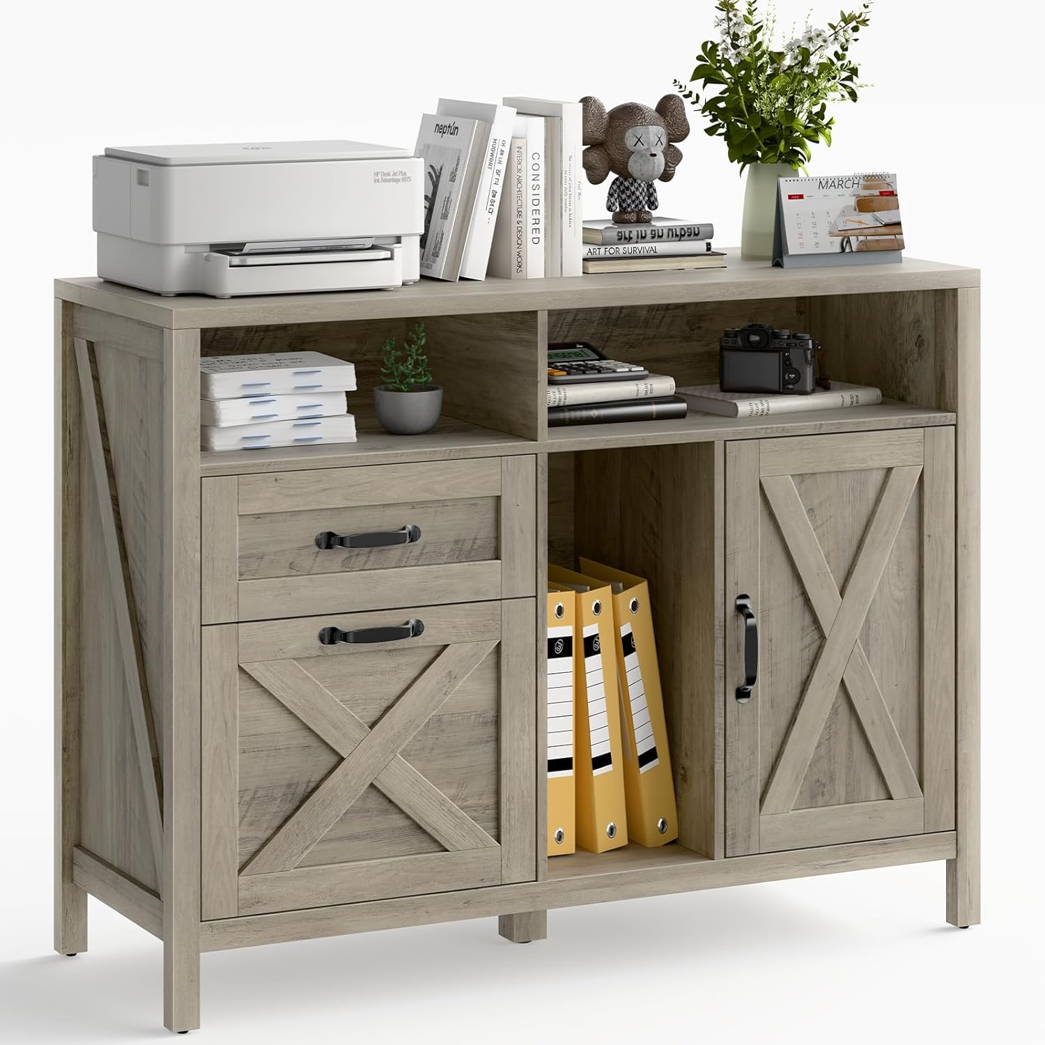 - 【Versatile File Cabinet】The wide filing cabinet with open storage shelves and file drawers for different organizing needs. The spacious desktop is ideal for office equipment such as printers and scanners
