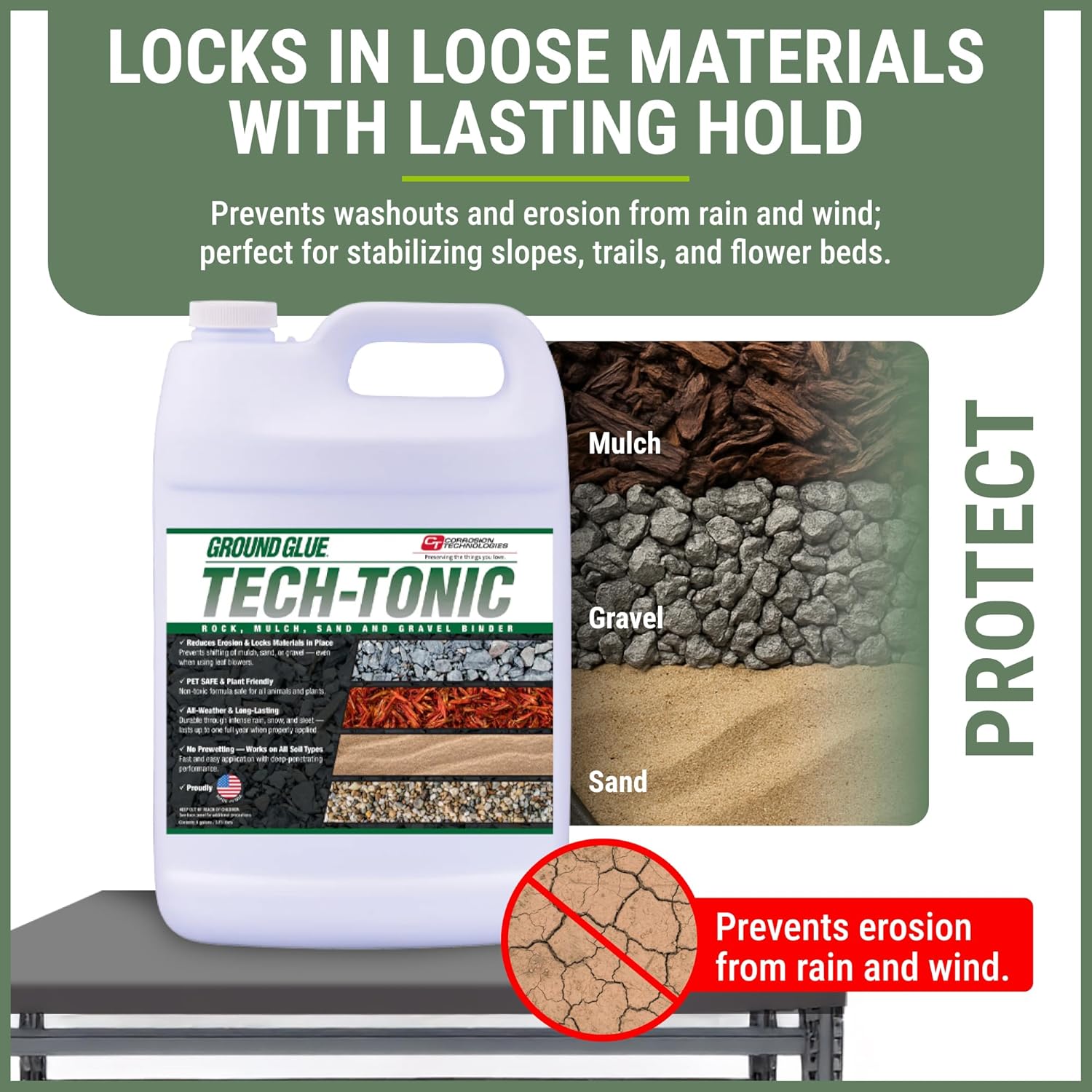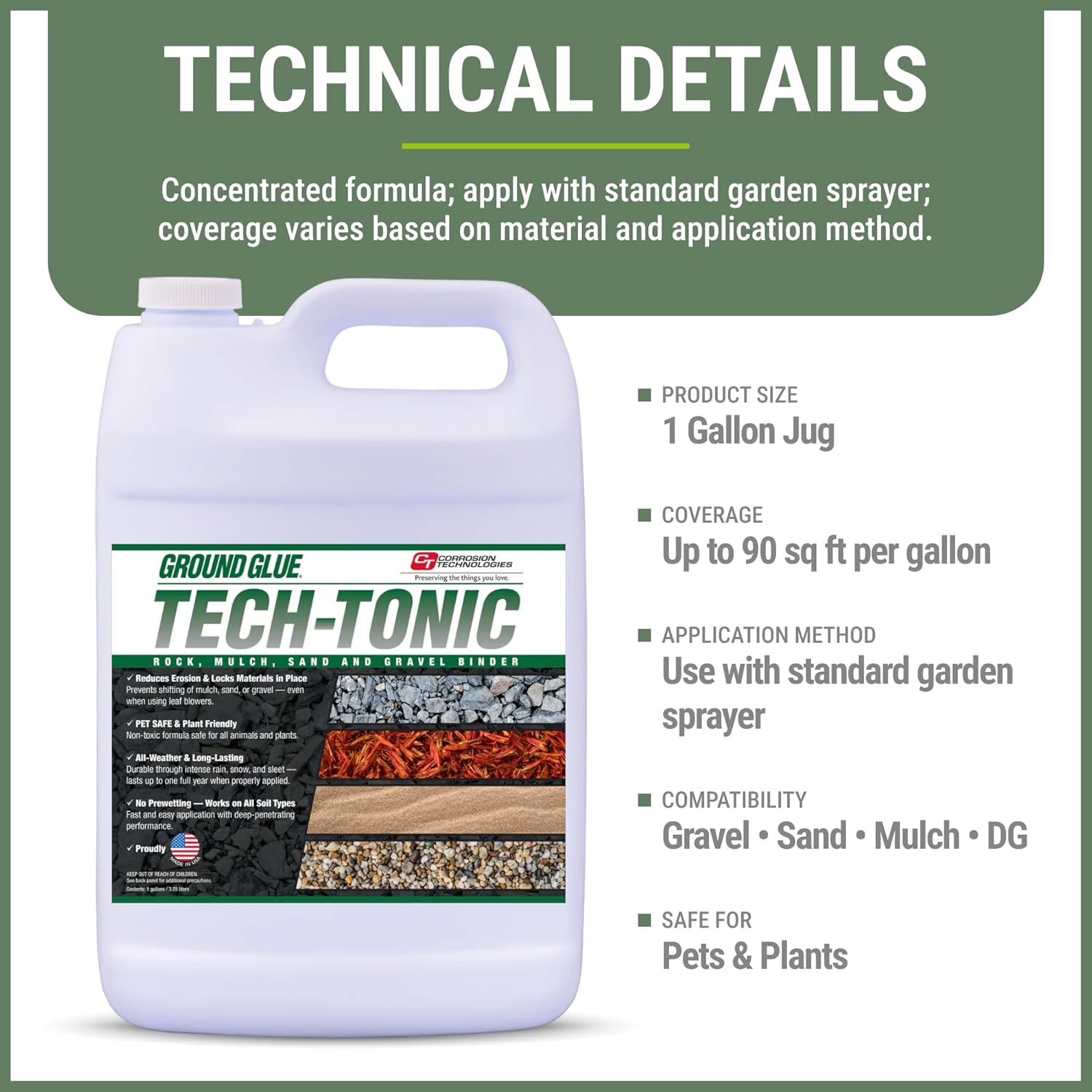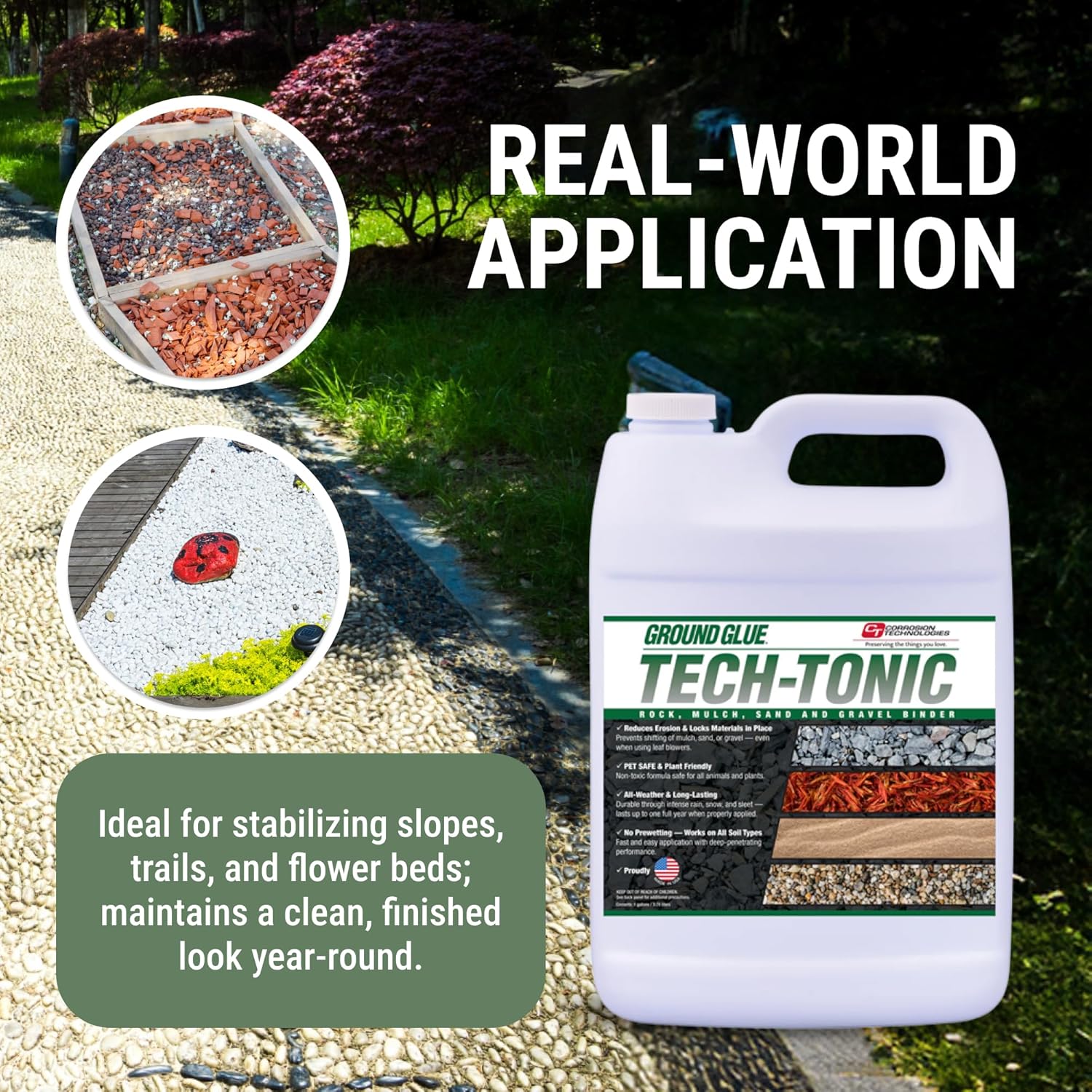 Ground Glue Tech-Tonic Landscape Adhesive for Rock, Mulch, and Sand, Weatherproof Long-Lasting Stabilizer for Trails & Slopes, Pet-Safe Binder for Pea Gravel, Bark & Flower Beds, Made in USA, 1 Gallon