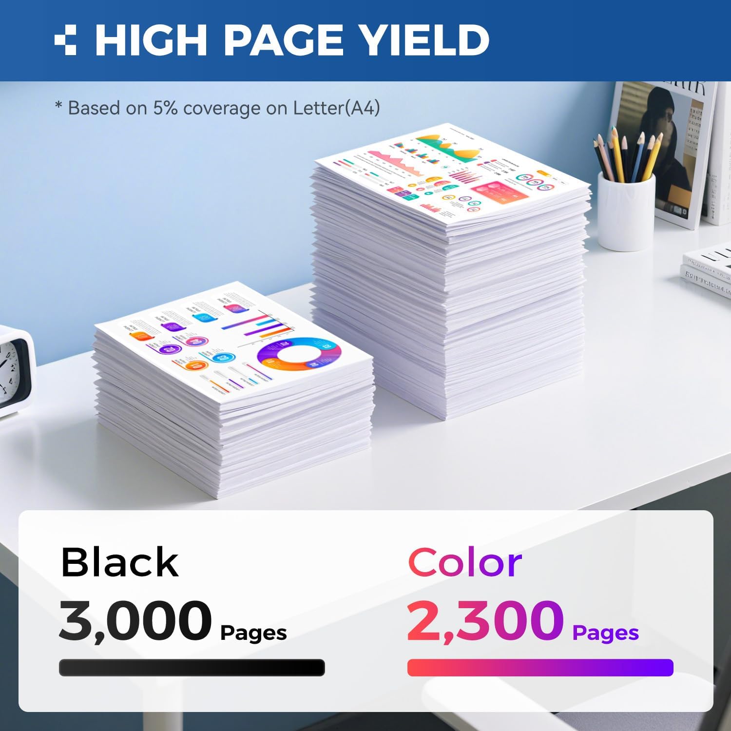 - Page Yield: Up to Black is 3,000 pages per black cartridge and Color is 2,300 Pages per color cartridge (Letter/A4, at 5% Coverage).