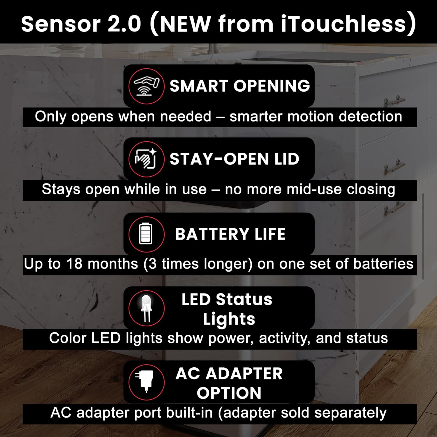 - Sensor 2.0 Technology – Smarter, Faster, Cleaner – Lid opens precisely when needed—no false triggers. Enhanced motion sensor ensures hygienic, touchless waste disposal