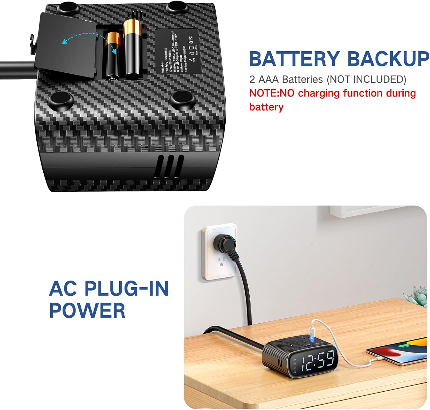 - 【𝐓𝐖𝐎 𝐏𝐨𝐰𝐞𝐫 𝐌𝐨𝐝𝐞𝐬 】This digital alarm clock offer 2 charging modes that is 3 AAA batteries and AC plug. It is not only a alarm clock but also a power strip with 6ft extension cords. When this home alarm clock charge with AC plug, 6 devices also can be charged at the same time. NOTE:NO charging function during battery backup mode.