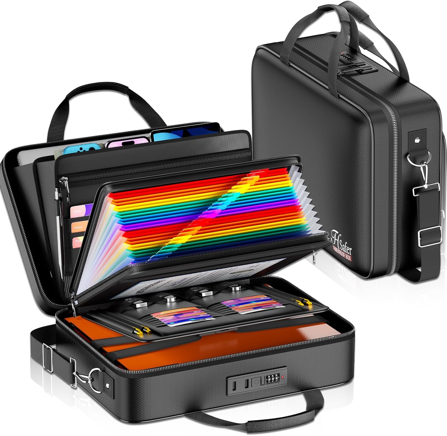 - [Hard-Shell File Organizer with Shoulder Strap]: The hard-shell exterior and fire-resistant construction provide two layers of defense, shielding your documents from dust and everyday marks. Equipped with elegant PU leather handles and a removable shoulder strap, this document organizer offers greater mobility compared to conventional safes. Blending aesthetic appeal with robust protection, this sleek document safe is both sturdy and surprisingly lightweight—a ideal solution for professional trips, household organization, and emergency readiness