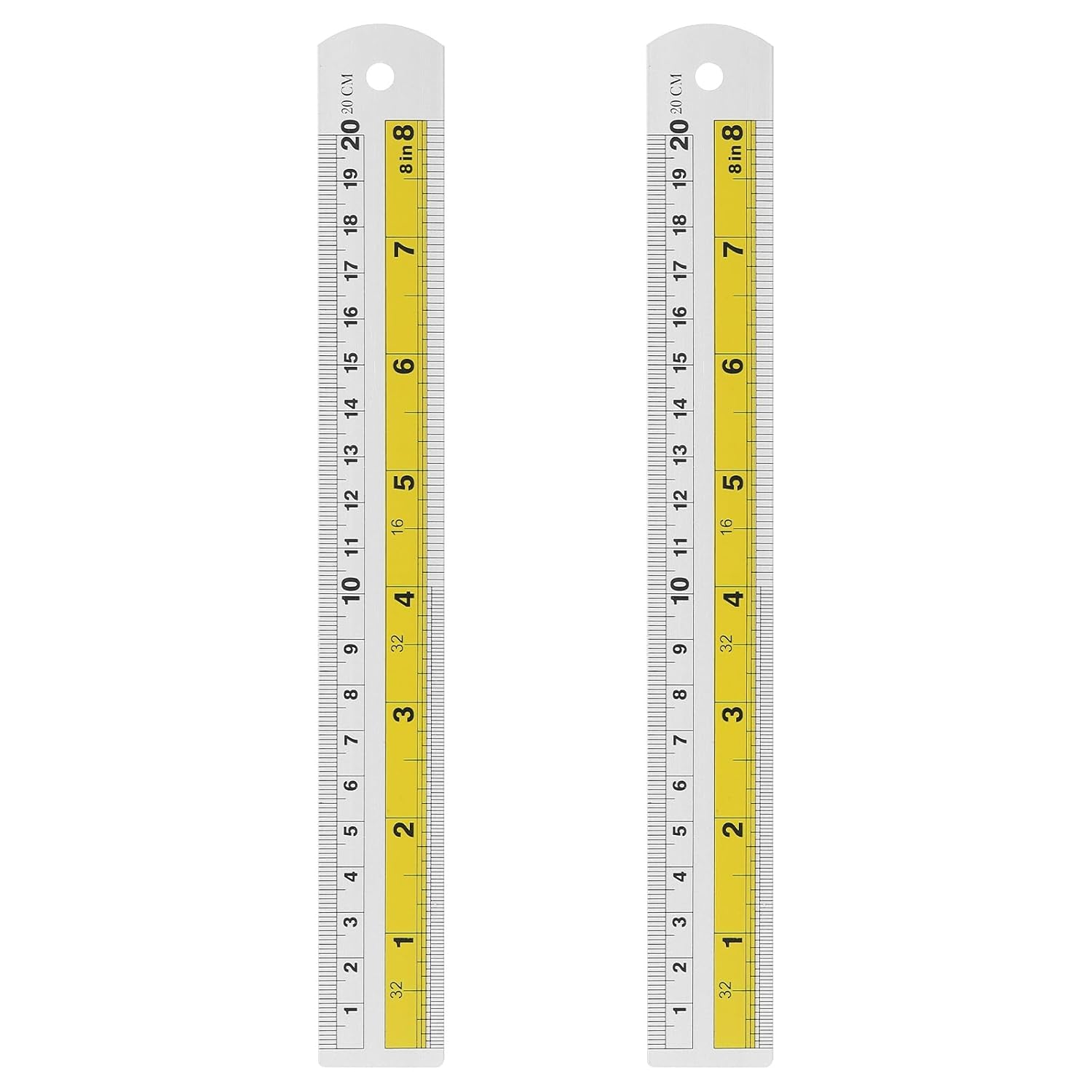 HARFINGTON 2pcs Metal Straight Ruler 20cm Metric SAE Aluminum Alloy Measuring Rulers Scale Tool with Hole for Measure Study Reading Classroom Office, Yellow
