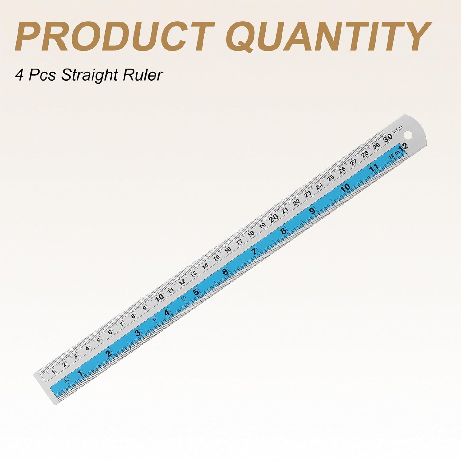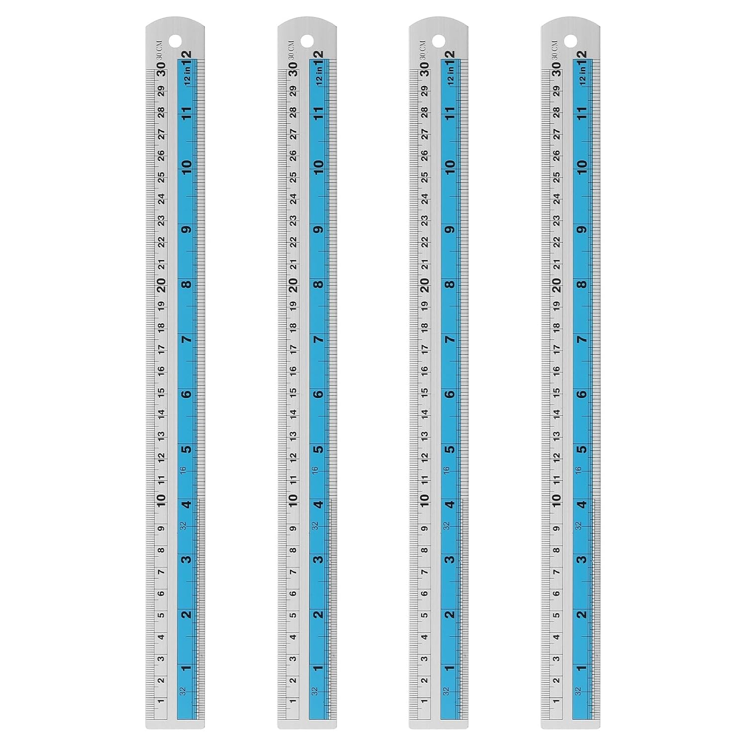 HARFINGTON 4pcs Metal Straight Ruler 30cm Metric SAE Aluminum Alloy Measuring Rulers Scale Tools with Hole for Measure Study Reading Classroom Office, Blue