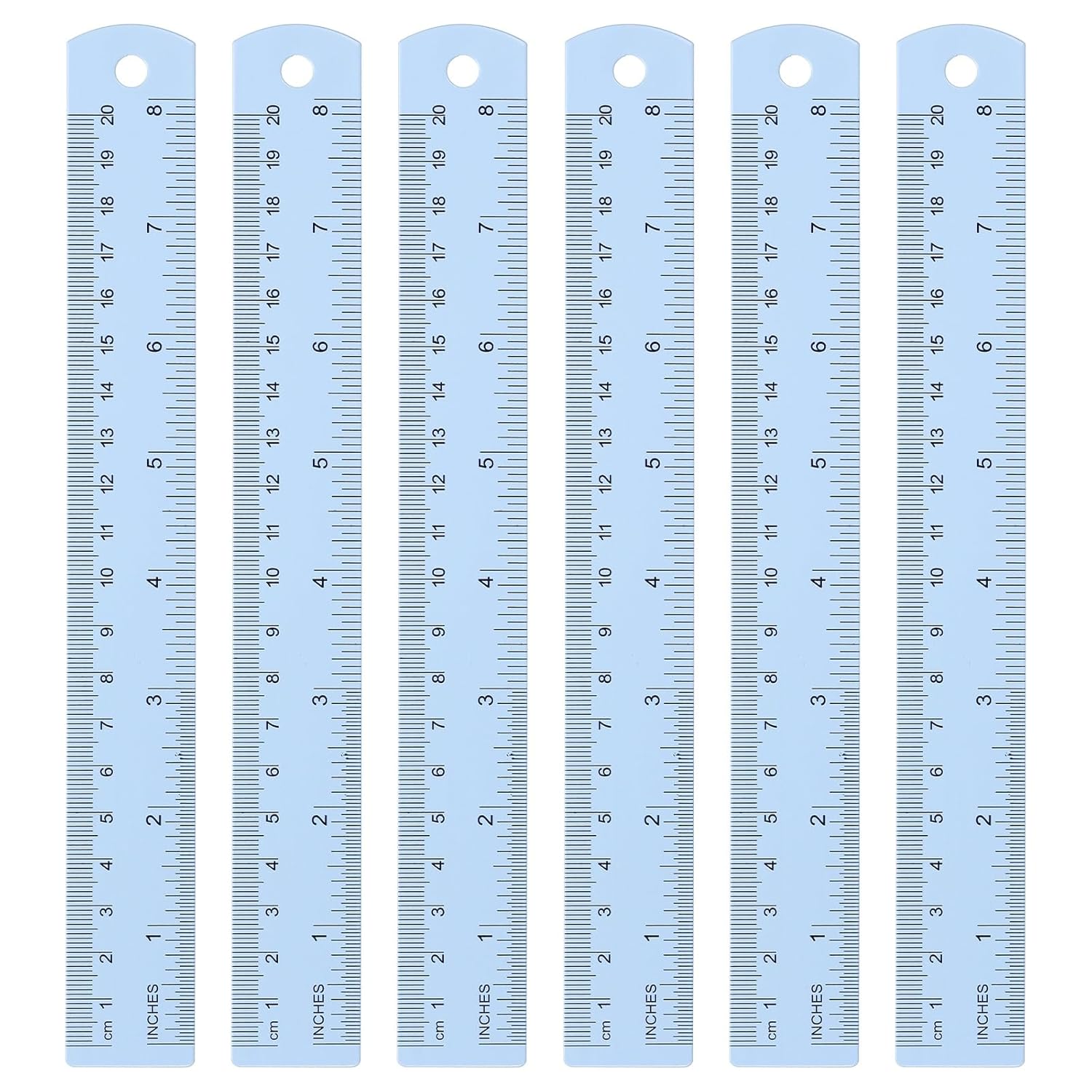 HARFINGTON 6pcs Metal Straight Ruler 20cm Metric SAE Aluminum Alloy Measuring Rulers Scale Tool with Hole for Measure Study Reading Classroom Office, Light Blue
