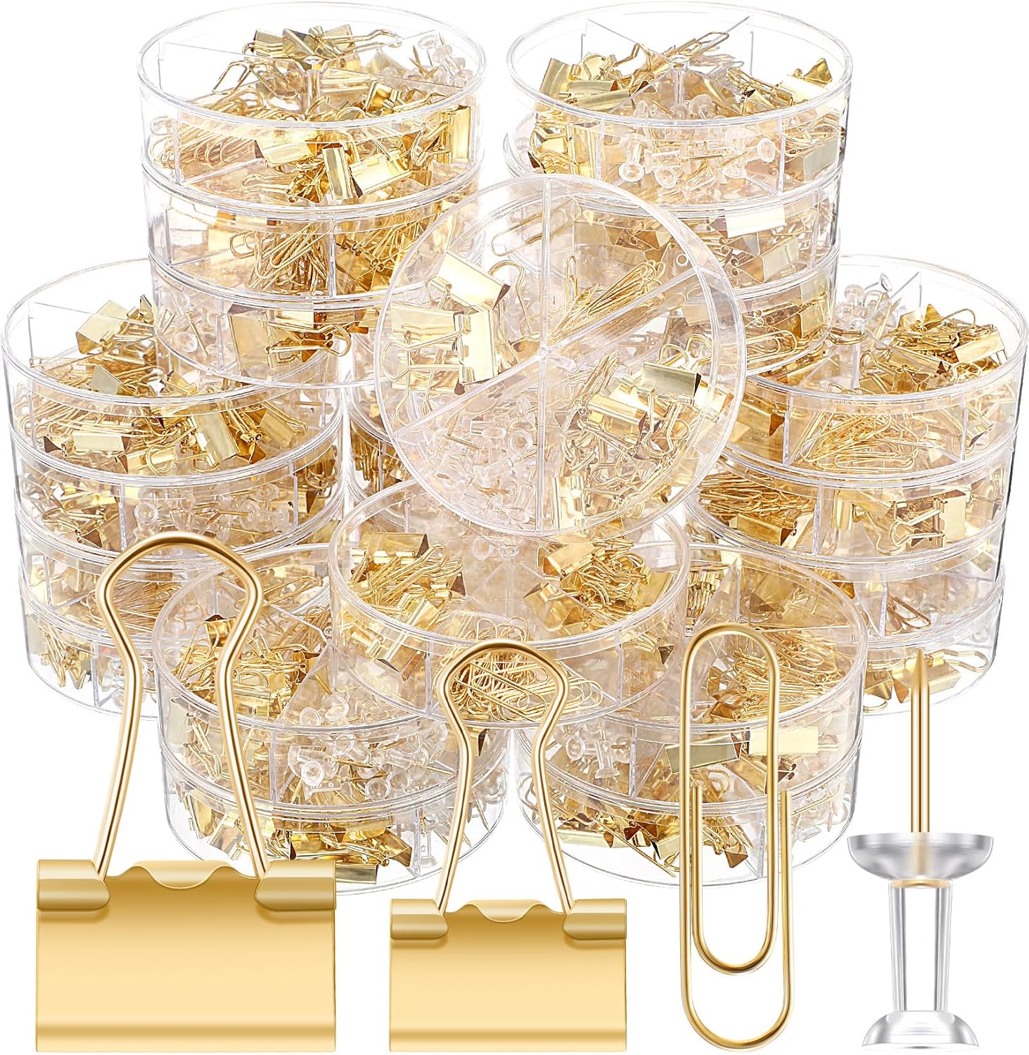1560 Pcs Paper Clips and Binder Clips Assorted Sizes, Large Medium Small Binder Clip Paperclips Thumb Tacks, College Supplies Home Office Supplies Document Organizing(Gold)