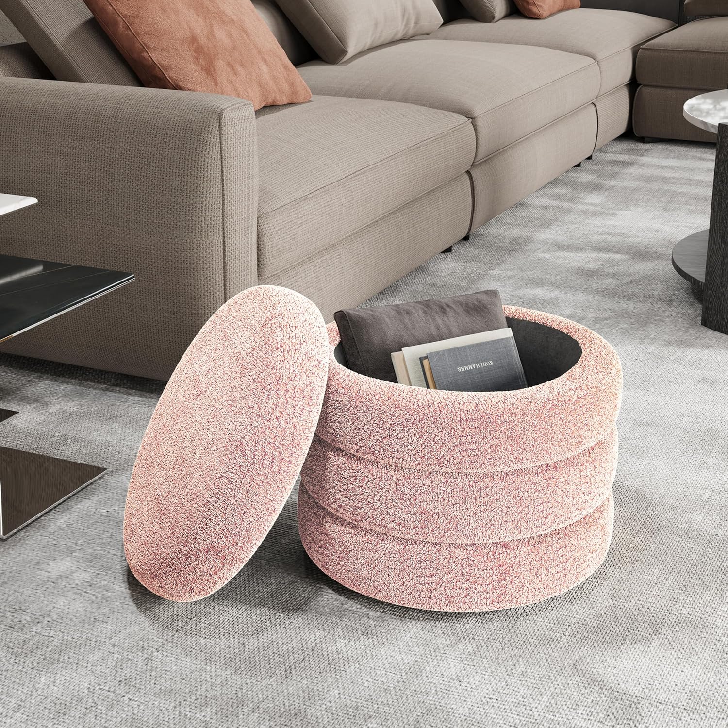 Storage Ottoman, Round Ottoman with Storage, Vanity Stool Foot Rest with Removable Lid, Round Boucle Upholstered for Living Room Pouf Footstool (Pink)