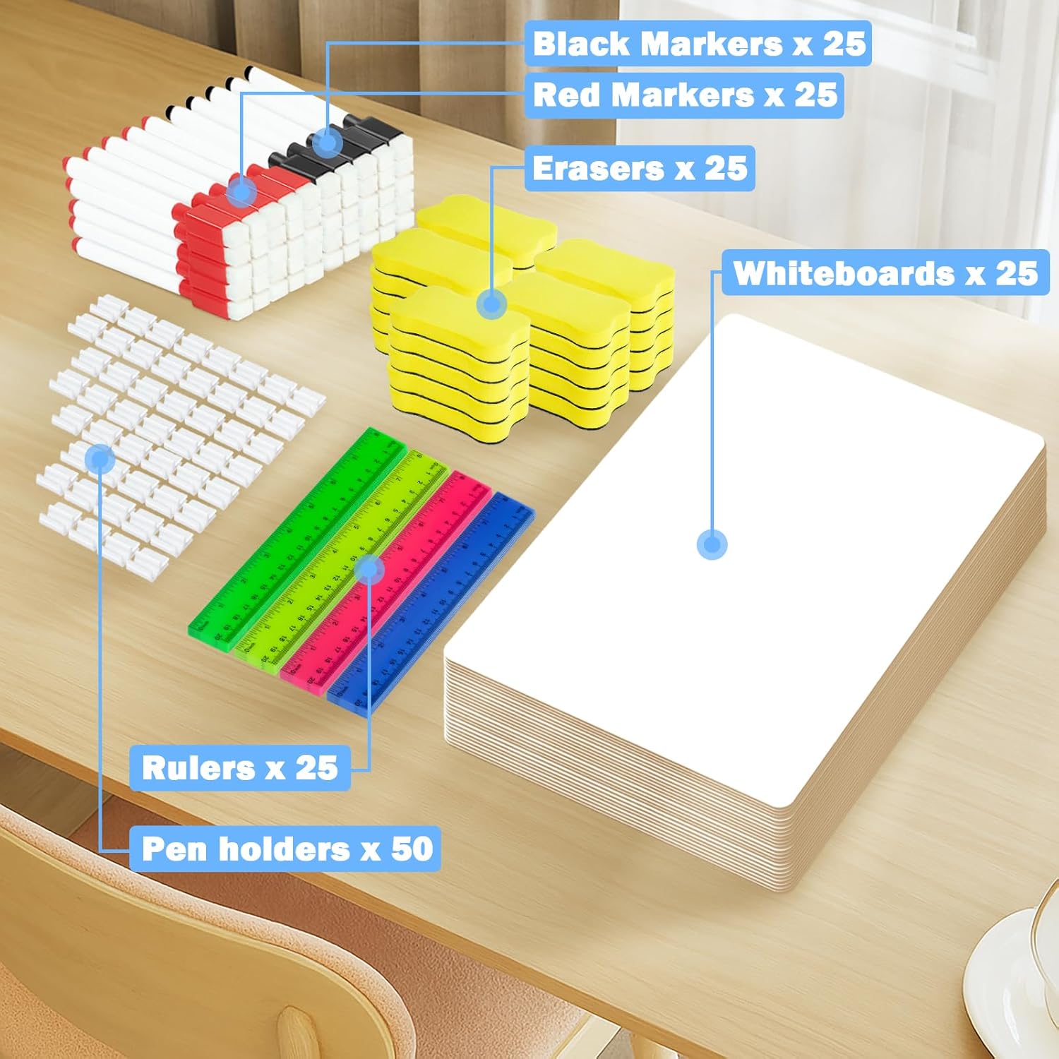 - Included Components : 25 Colorful Rulers, 25 Red and Black Markers, 25 Whiteboards and Erasers, 50 Clips