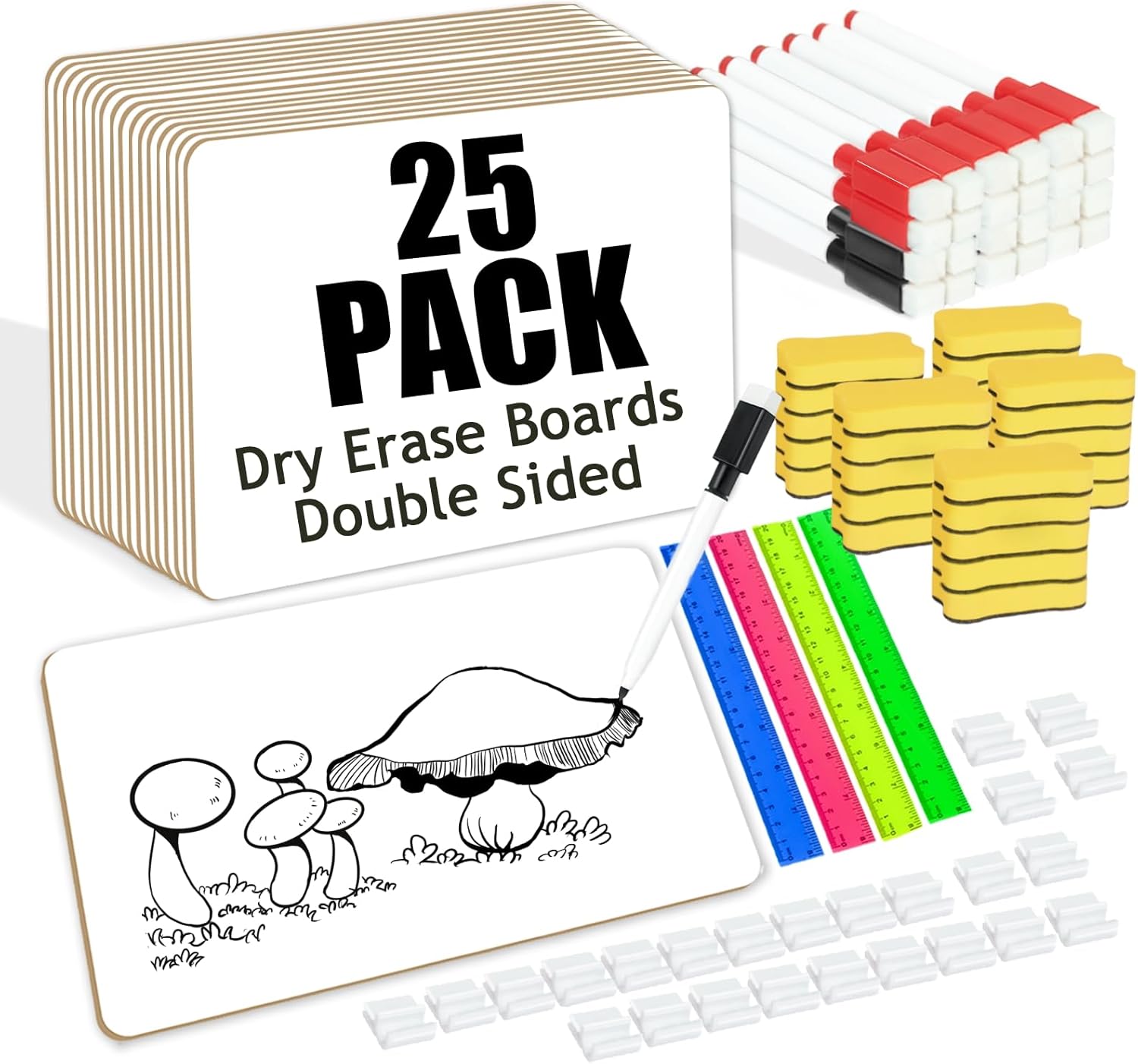 25 Pack Dry Erase Boards 9'' x 12'' Mini Double-Sided Whiteboards Safe Rounded Edges, Includes 25 Erasers, Markers, Rulers & 50 Clips, Perfect for Students, Teachers, School & Office Use