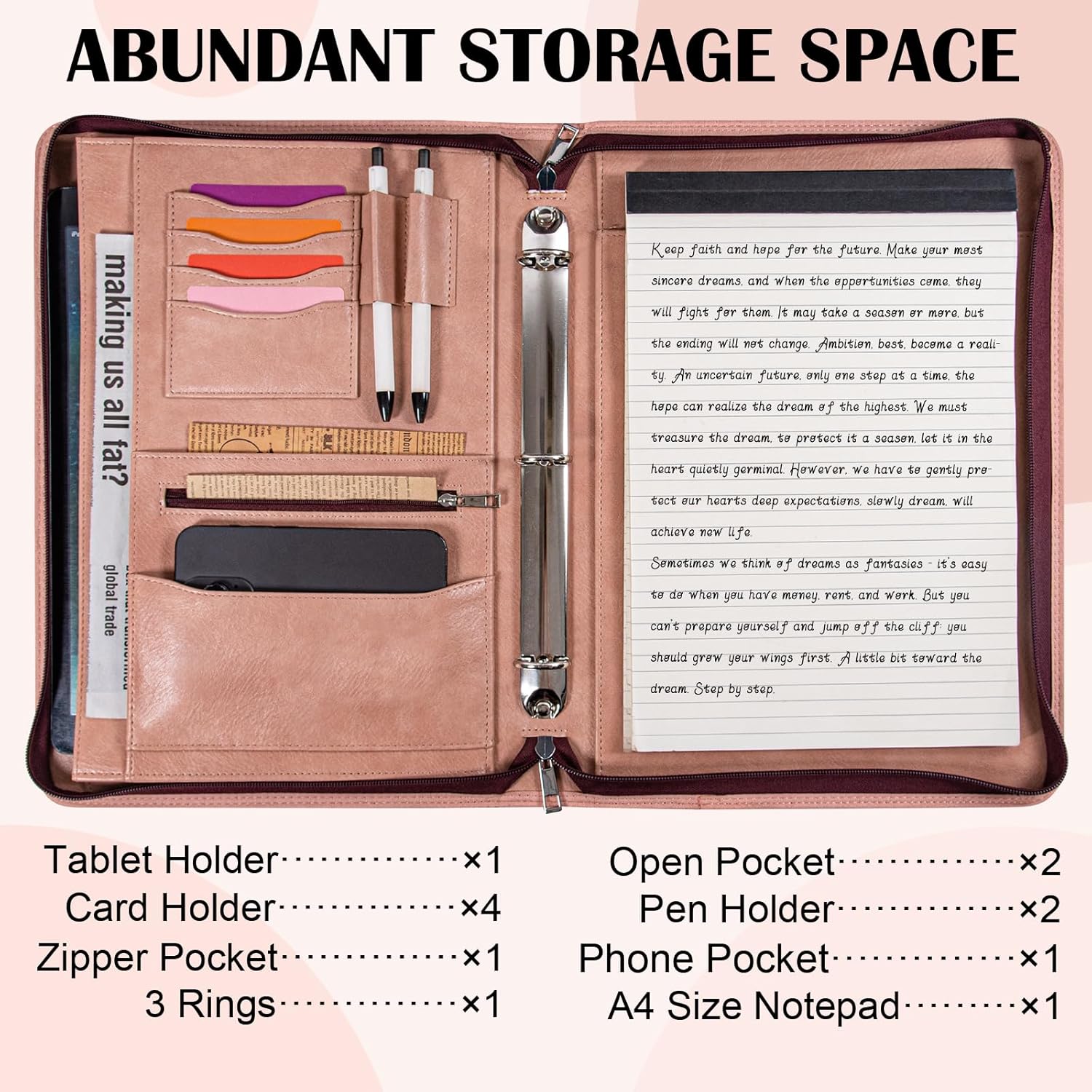 - 【Premium&Stylish-Pink Portfolio Binder】 Calfinder personalized portfolio organizer is handmade from PU leather, waterproof and durable while balancing elegance and fashion. The Pink padfolio for women is elegant and exquisite. The Calfinder business portfolio is the perfect gift choice for lawyers, teachers, graduates, employees, and any other professionals.