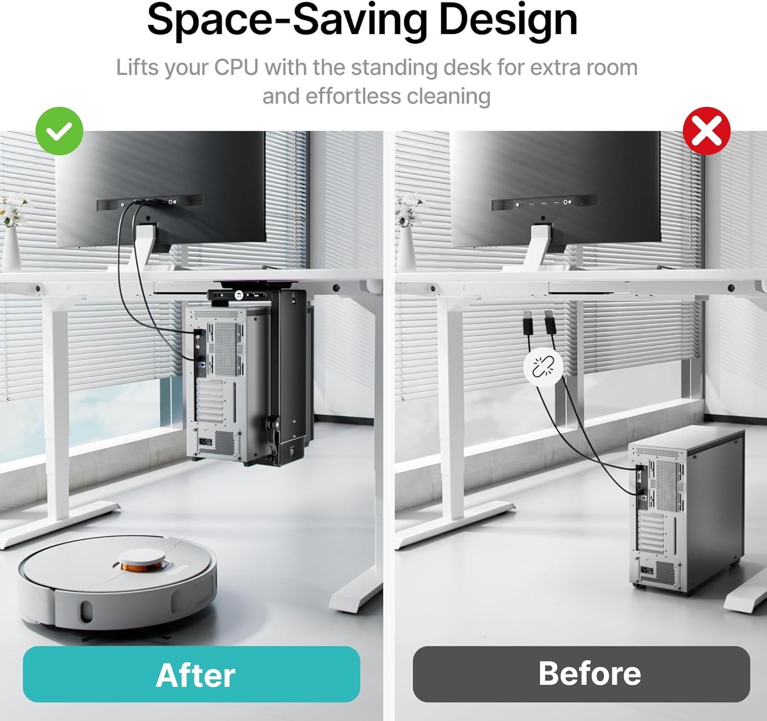 - 【Under desk mount】This computer tower stand can be installed under your desk, ensuring easier use of the CPU to enhance your working or gaming experience. Mount your CPU under the desk can prevent dust buildup from carpets and reduces the risk of accidental kicks, spills, or pet hair clogging your vents. In addition, it can free up your precious floor and desk space, creating a tidier space for you.