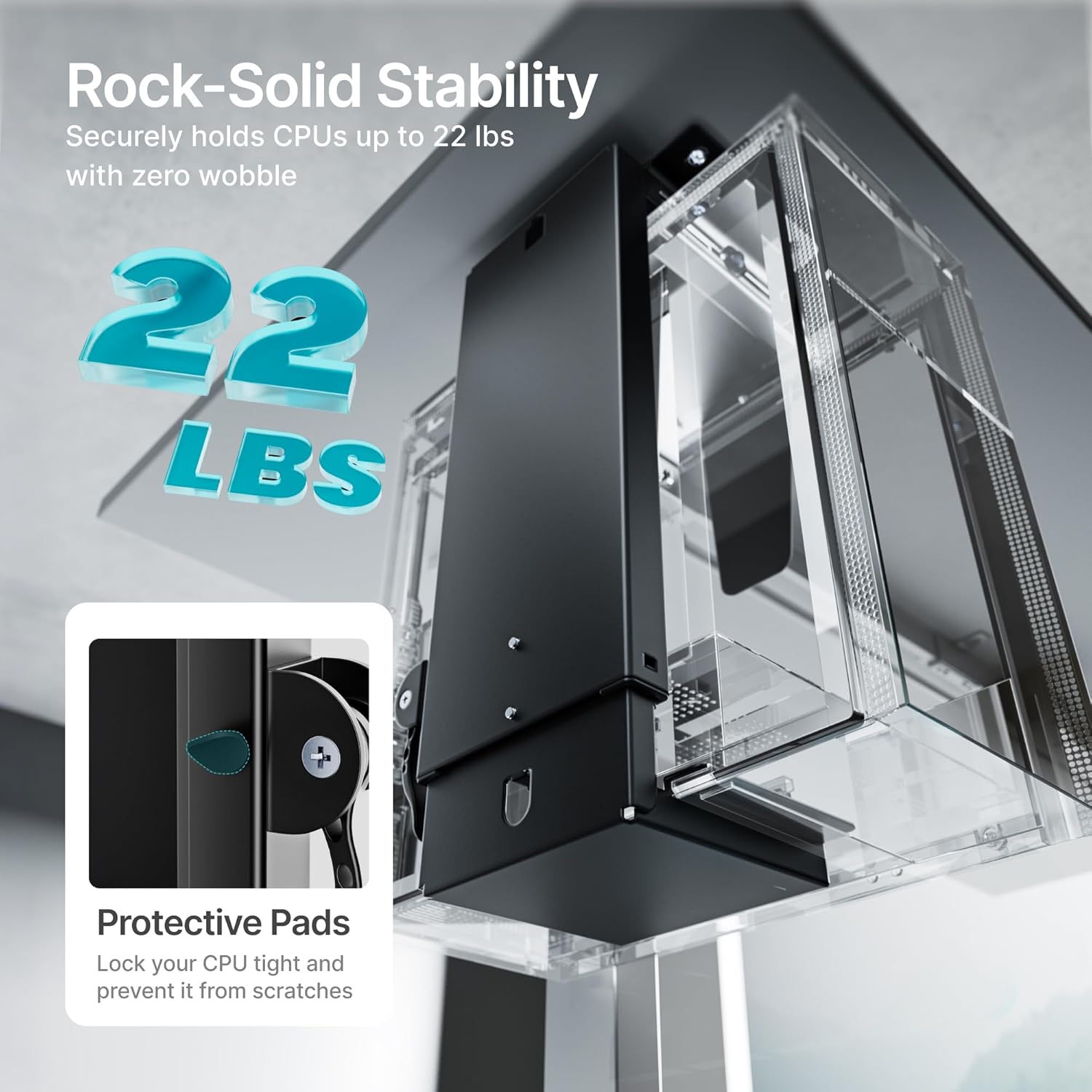 - 【Solid and Secure Design】Built from reinforced cold-rolled steel, this under desk computer mount can securely hold heavy cases up to 22 lbs. In addition, this CPU bracket features a notable scratch resistant design. It comes with 12 thick anti-skid pad points that not only protect your PC case from scratches, but also reduce the shaking of your CPU, ensuring your device is firmly placed while in use. It’s a long-term armor system for your PC!