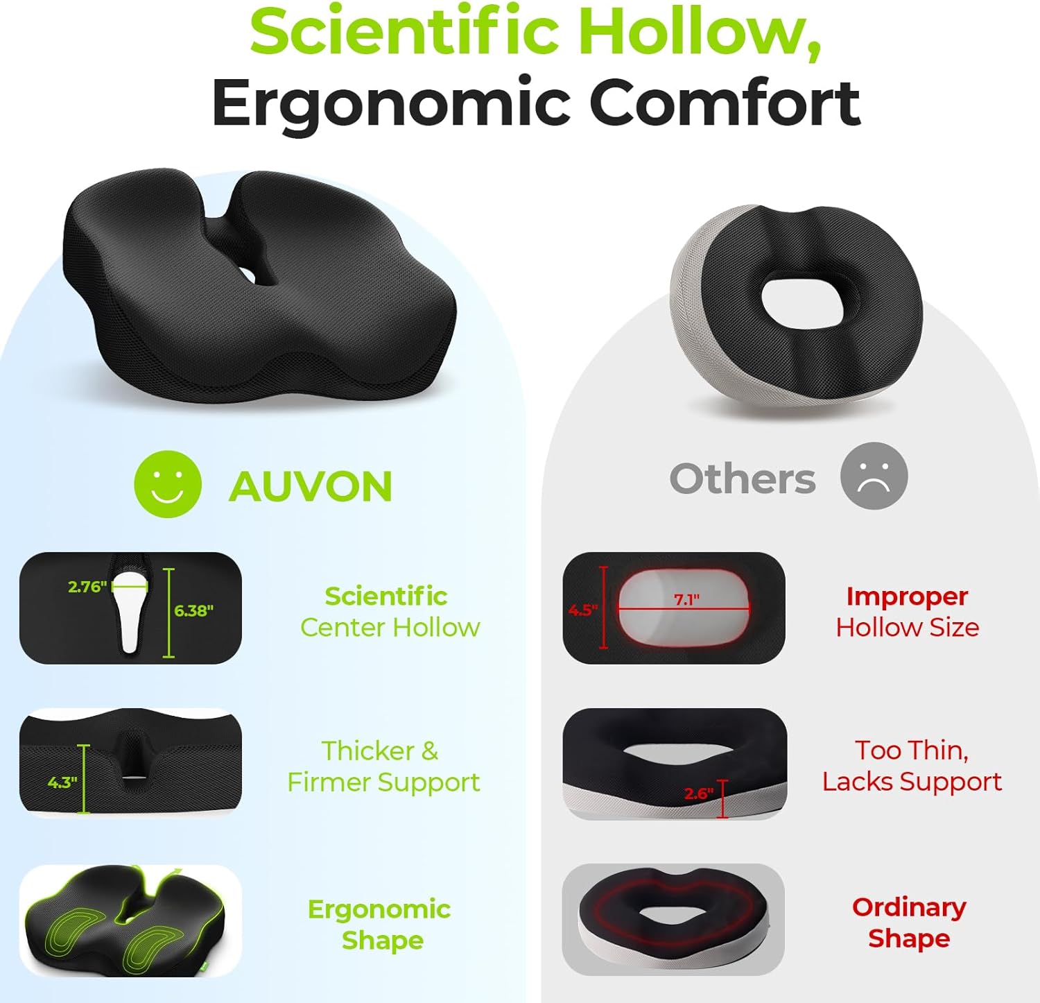AUVON Ergonomic Donut Pillow Seat Cushion for Hemorrhoid & Tailbone Pain Relief, Thick Memory Foam Chair Cushions with Firm Support for Coccyx, Sciatica, Pressure Sores, Pregnancy, Postpartum Recovery