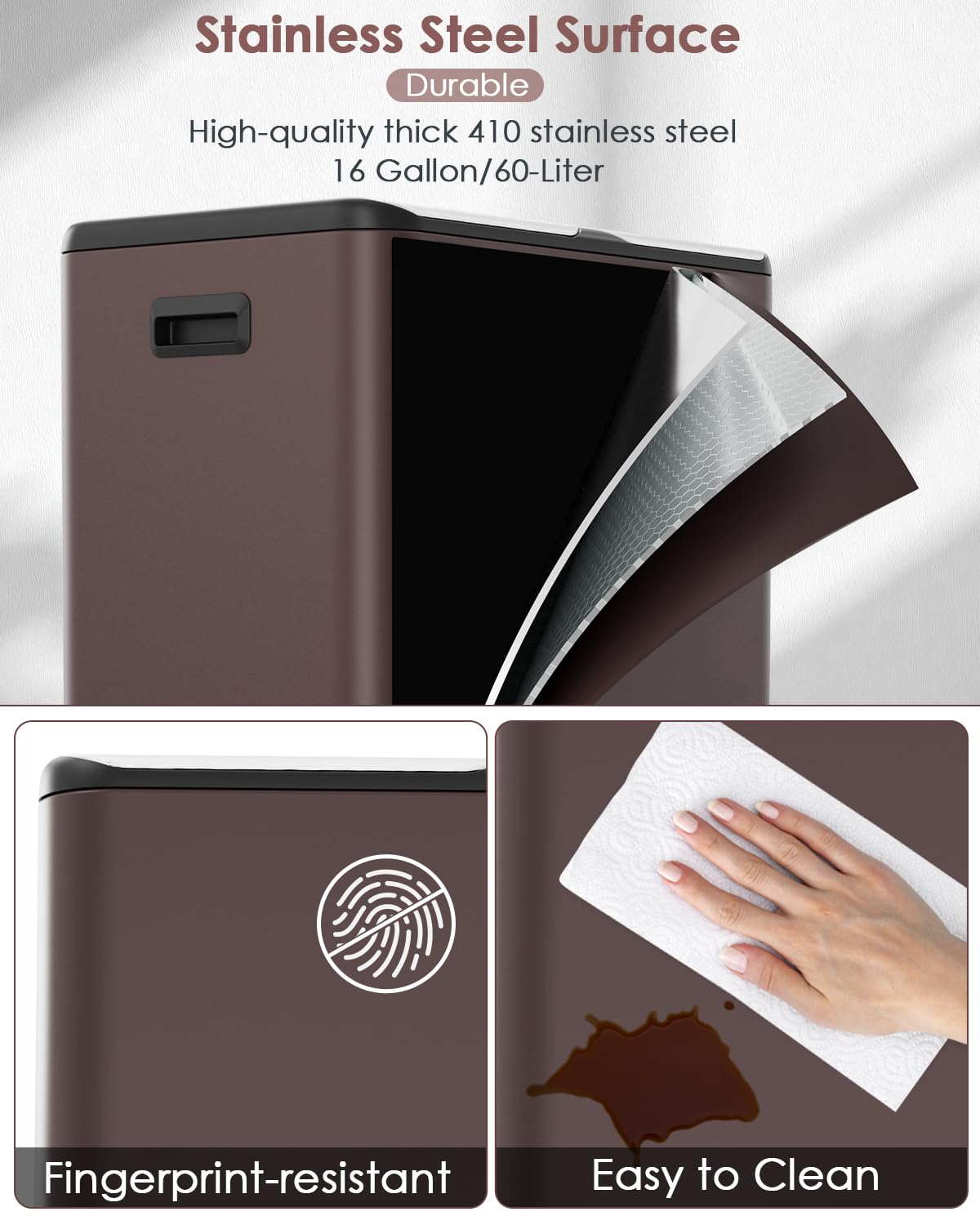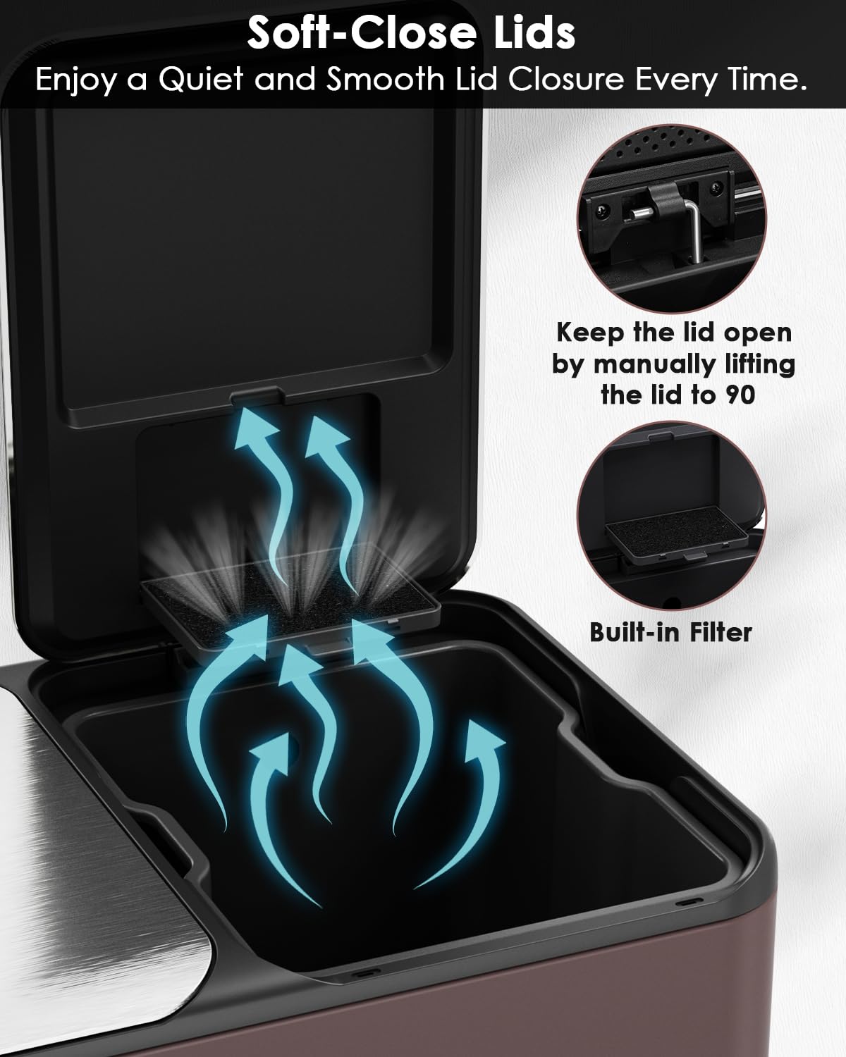 Arlopu 16Gal Dual Trash Can w/2 Built-in Box for Odor Control, Hands-Free Kitchen Garbage Bin, Recycle Waste Dustbin, Soft-Close Lid, 2 Buckets,Foot Pedal, Side Handle, Airtight,for Home Office
