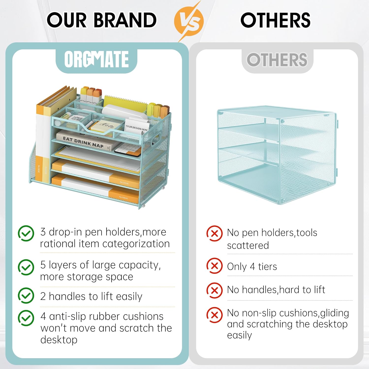 - User Friendly-2 round wrap-around handles + 4 rubber anti-slip feet, provide you with a comfortable grip at the same time, can make the letter tray organiser is not easy to slide and scratch the desktop, to protect the surface of the desktop. Perfect as a file organizer for desk or document organizer, it fits seamlessly into compact workspaces or classroom organization setups