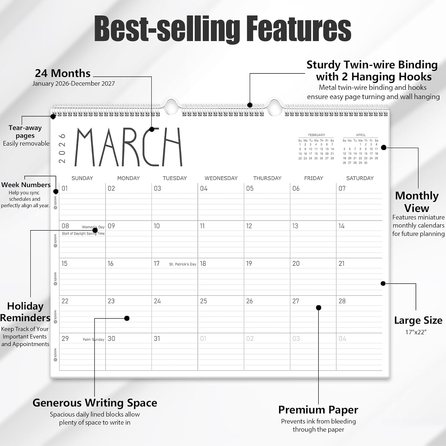 GuassLee Large Wall Calendar 2026-2027, 24-Month 22" x 17" Wall Calendar from Jan. 2026 to Dec. 2027, Large Desktop Hanging Monthly Planner with Thick Paper, Ruled Blocks for Home School Office