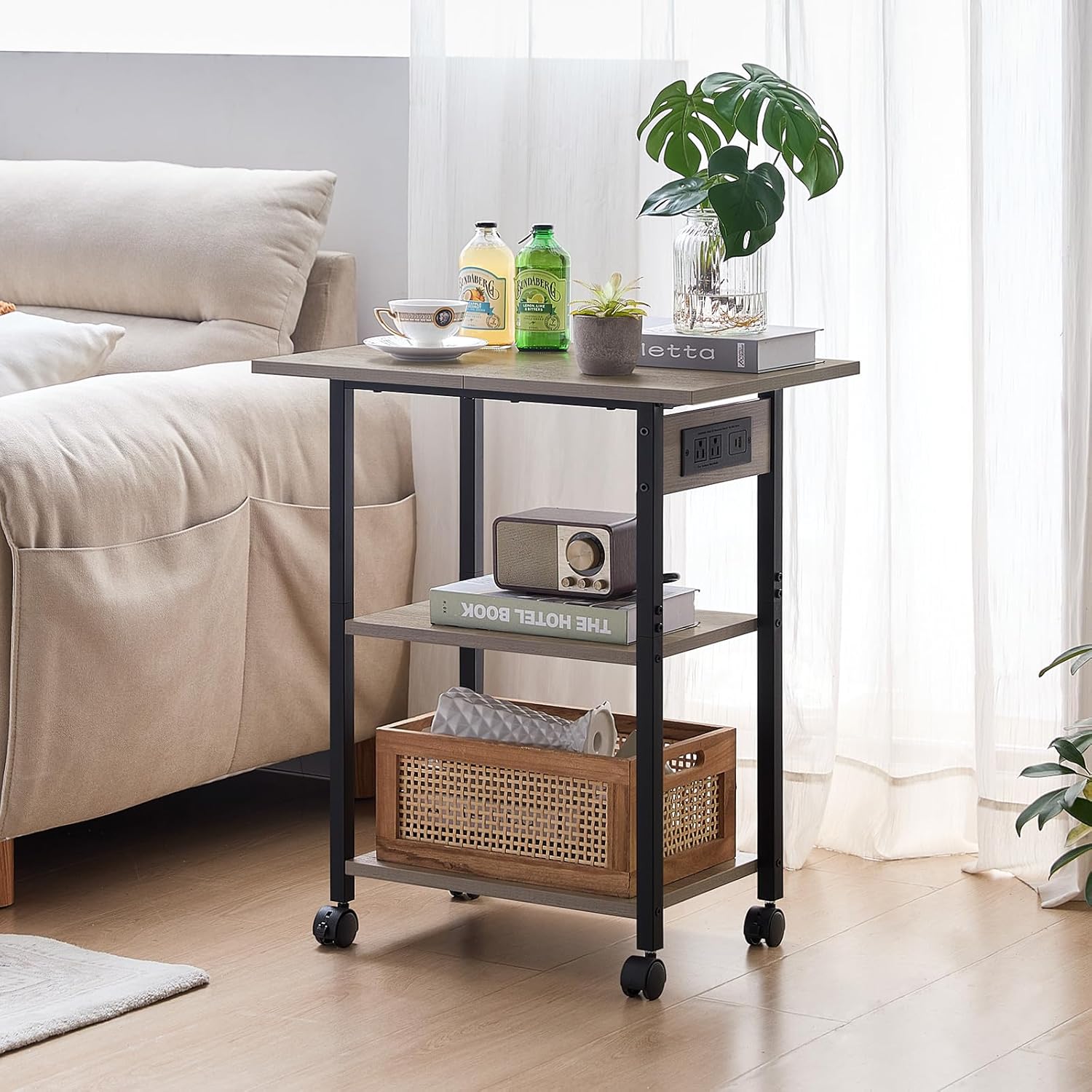 Lerliuo 3-Tier Printer Stand with Charging Station, Industrial Mobile Printer Table with Storage Shelf and Steel Frame, Rolling Printer Cart Holder with Lockable Wheels for Home, Office (Oak)