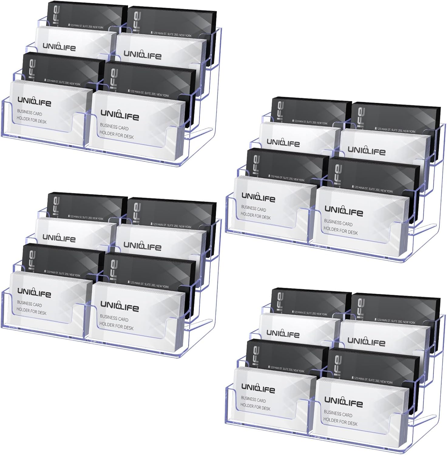 Uniclife 4 Pack Acrylic Business Card Holder for Desk 8 Slots Clear Business Card Display Stand for Men & Women Desktop Business Card Organizer Card Stand for Office Home Exhibition, 480 Card Capacity