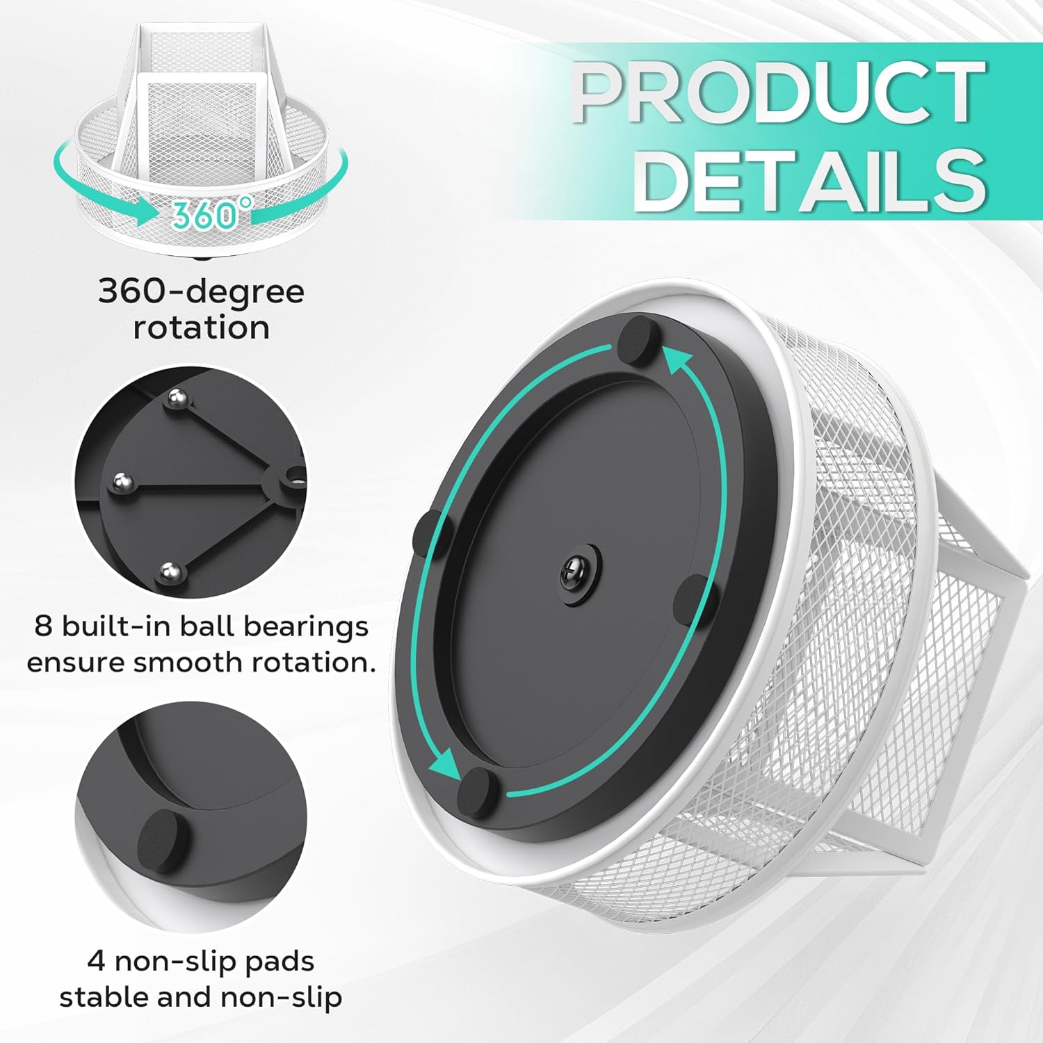 YINGHUA Metal Mesh Desk Organizer with 5 Compartments and Rotating Pencil Holder Pen and Stationery Organizer for Office Home School Anti Slip Base White