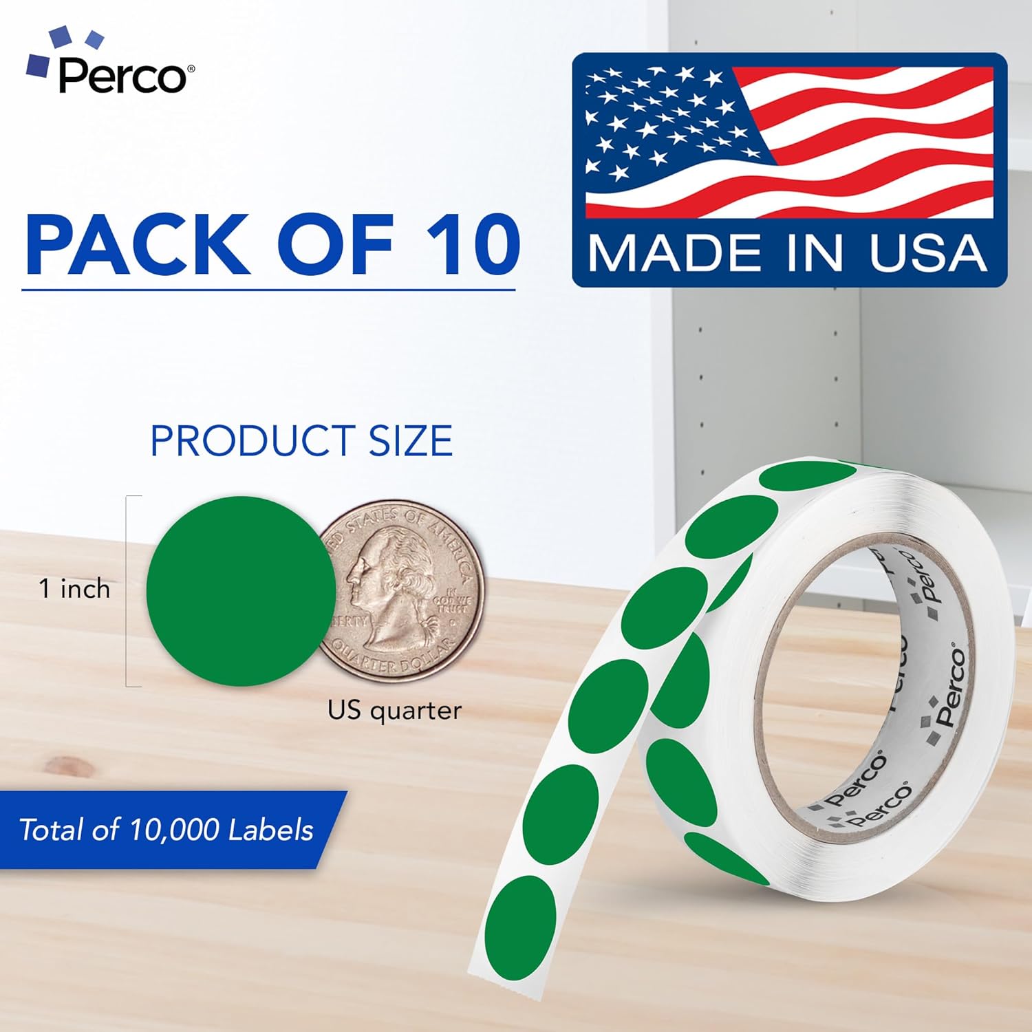 Perco Green 1-Inch Perforated Circle Dot Sticker Labels — 10 Rolls, 10,000 Round Stickers — with Permanent Adhesive for Inventory Management, Color Coding, Garage Sales, Crafts—Made in USA
