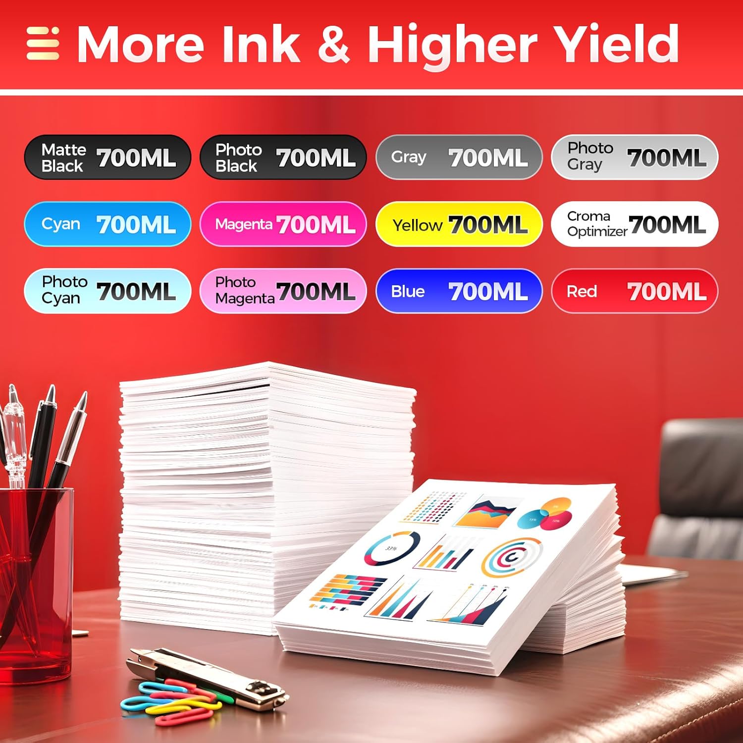 - Ink Volume: The capacity is 700ML per ink cartridges, Total ink volume is 8400ml,