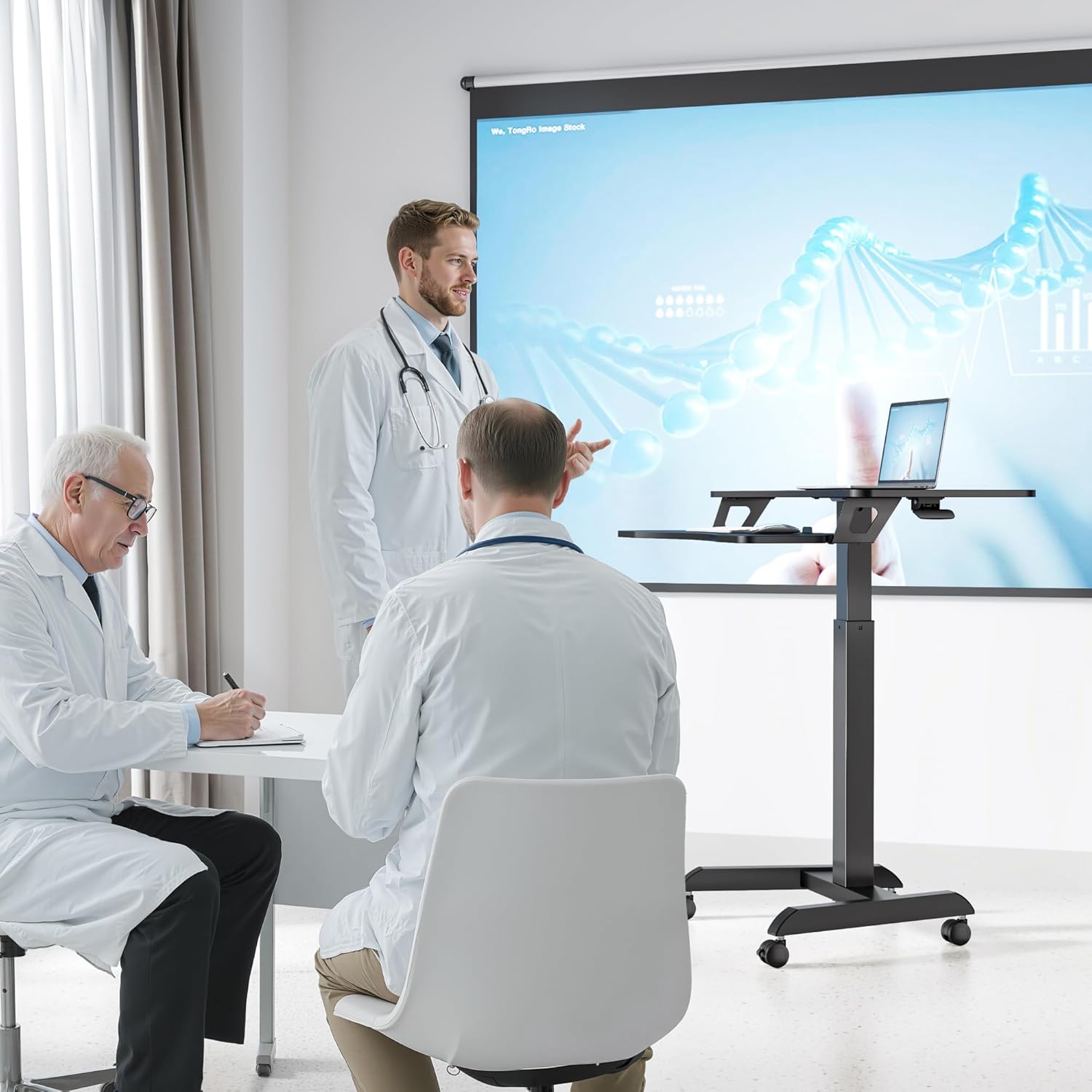 - 【Spacious Comfort Boost】This mobile laptop stand offers 30% more space than standard small desks, featuring a generous 31.2"L × 27.5"W tabletop. Whether you're using a laptop, taking notes, or keeping your favorite mug nearby, you'll have ample room to stay organized, reduce clutter, and maintain focus. After hours of sitting, effortlessly raise your adjustable table with wheels up to 47.2 inches. This rolling desk can serve as an extension to other desktops whenever needed.