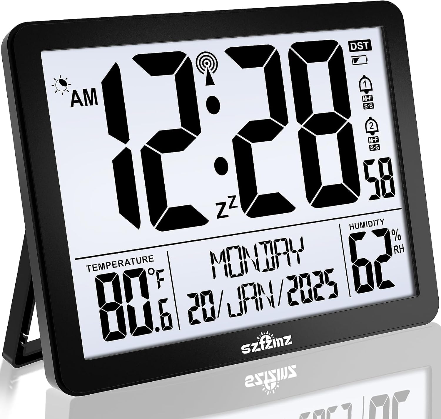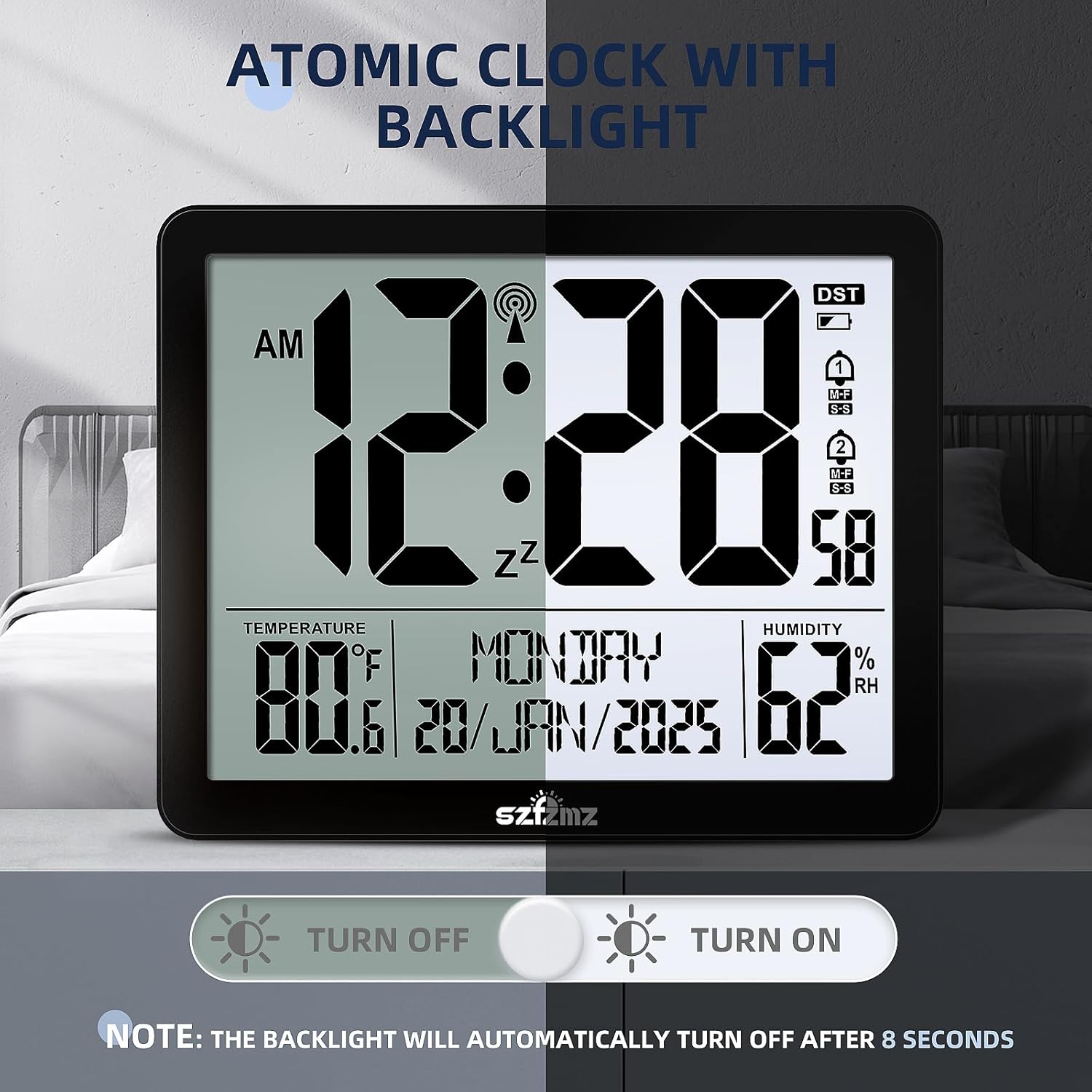 - 【Multi-Functional Digital Clock】 The digital wall clock has multiple uses. It not only shows you the time (12 or 24 hours), but it can also be used as a desk clock that can set 2 alarms. In addition, the atomic clock can display the date, month, day of week, temperature (℉ or ℃) and humidity, which is an excellent alarm clock for bedrooms, living room, office, bathroom decor, etc.