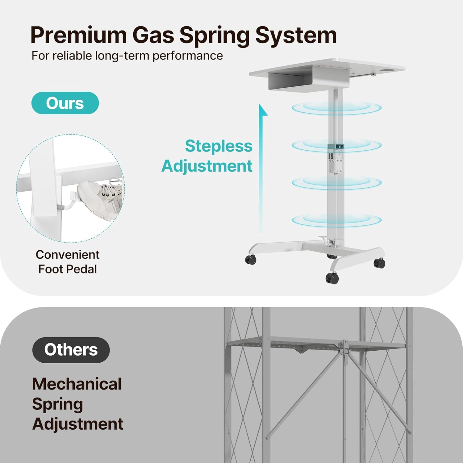 - 【Effortless Height Adjustment 】With a simple foot pedal press, the mobile laptop stand rises smoothly to your ideal height, no bending or tedious adjustments required. The gas spring has endured 20,000 tests. Whether typing, standing briefly, or sliding it back as a adjustable table with wheels for study, the reinforced I-beam base and thickened metal construction create a solid, anchored feel, ensuring lasting durability.