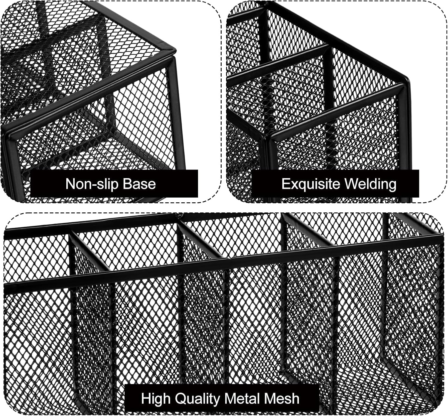 - 【Durable Metal Mesh Design】The black pen holder is crafted from sturdy metal mesh, ensuring long-lasting durability and resistance to wear. Its smooth edges and reinforced frame prevent scratches on surfaces or hands, while the non-slip rubber base pads provide stability. Ideal for daily use in offices, classrooms, or homes, offering a reliable solution for organizing pens, pencils, and other small items.